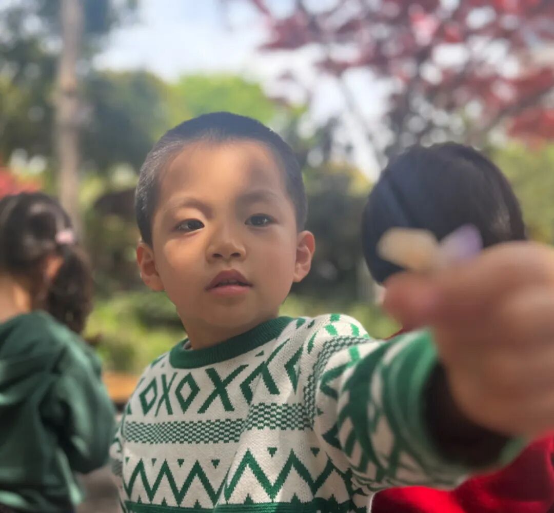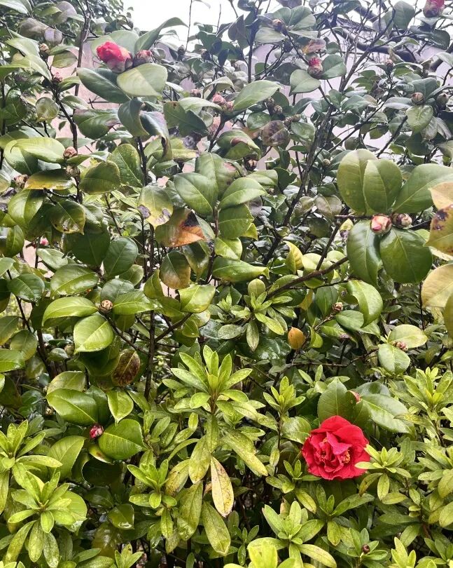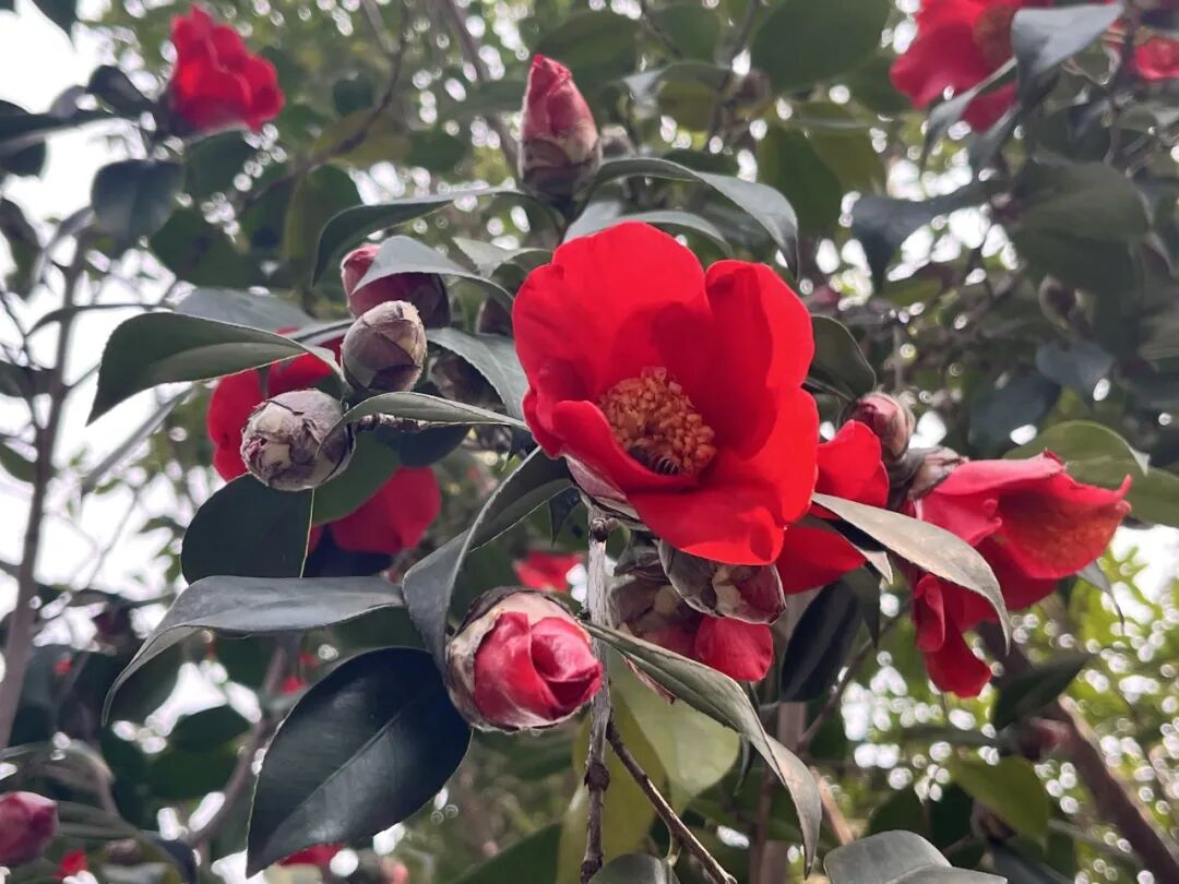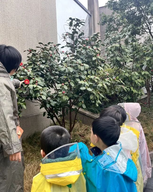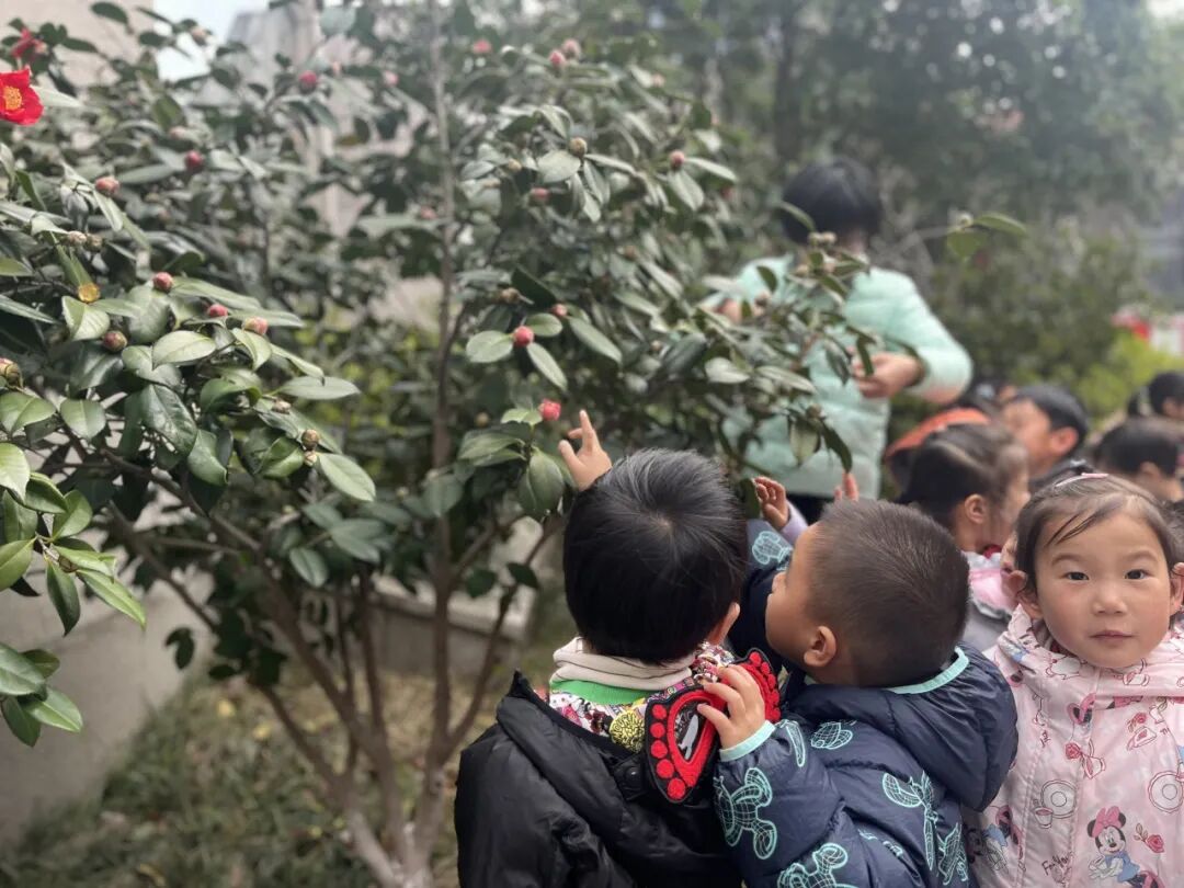 有小朋友发现了蜜蜂在山茶花上采蜜。