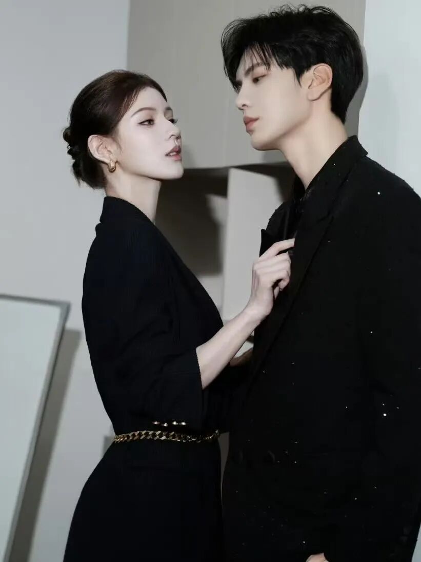 毕雯珺一身黑色西装,笔挺的剪裁勾勒出他挺拔的身姿,西装面料泛着低调的光泽,增添了几分精致感。张予曦同样身着黑色西装外套,低领设计巧妙地展现出精致的锁骨线条。黑色系情侣装不仅在色彩上达成了高度的统一,更通过细节处的精心设计,展现出一种势均力敌的般配感。
