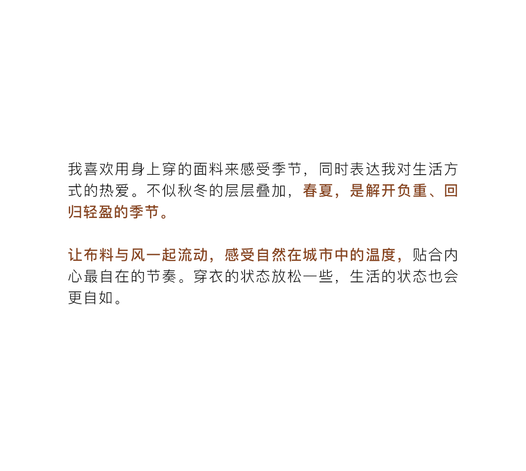 摘要:亚麻,松弛感自然而生。 \x0d\x0a我喜欢用身上穿的面料来感受季节,同时表达我对生活方式的热爱。 \x0d\x0a不似秋冬的层层叠加,春夏,是解开负重、回归轻盈的季节。