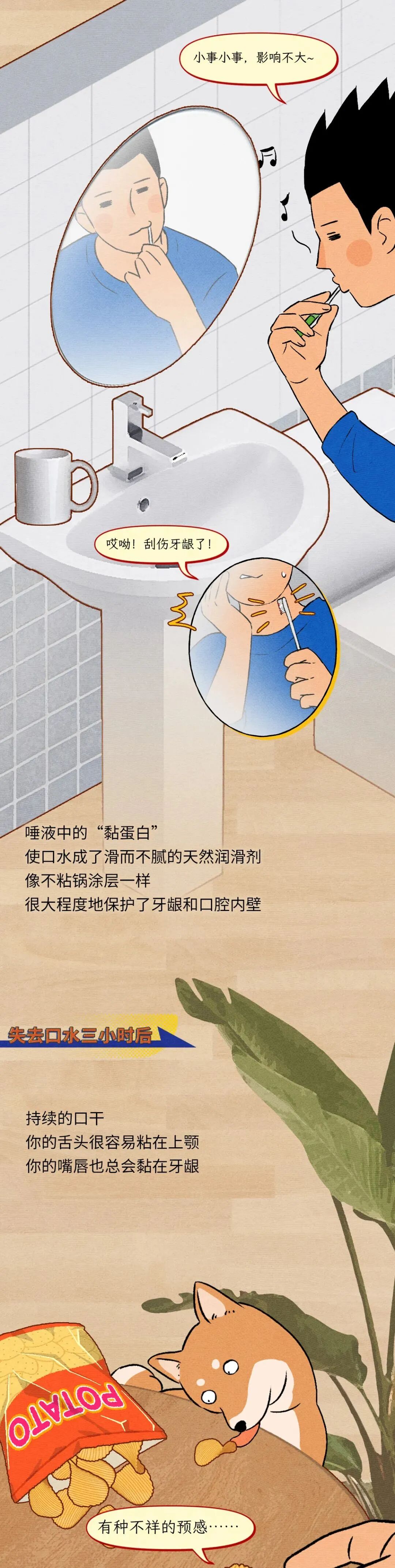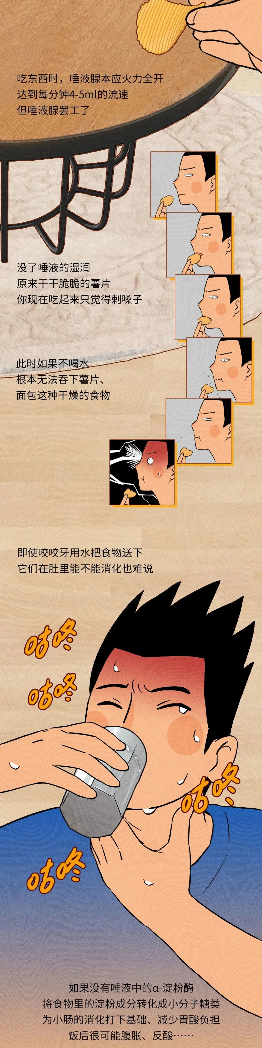 先天疾病、癌症、药物副作用,甚至年龄增长、生活压力,都可能导致口干燥症。据统计,全球超10%的成人会出现口干燥症,50岁以后,发生率更是达到了约25%。科学家尝试了多种多样的模拟唾液手段,但至今无一能完美替代珍贵的唾液。此外,口水过多也应引起注意,唾液分泌过多一般是由于饮食因素所致,也可能由口腔疾病、物理刺激引起。