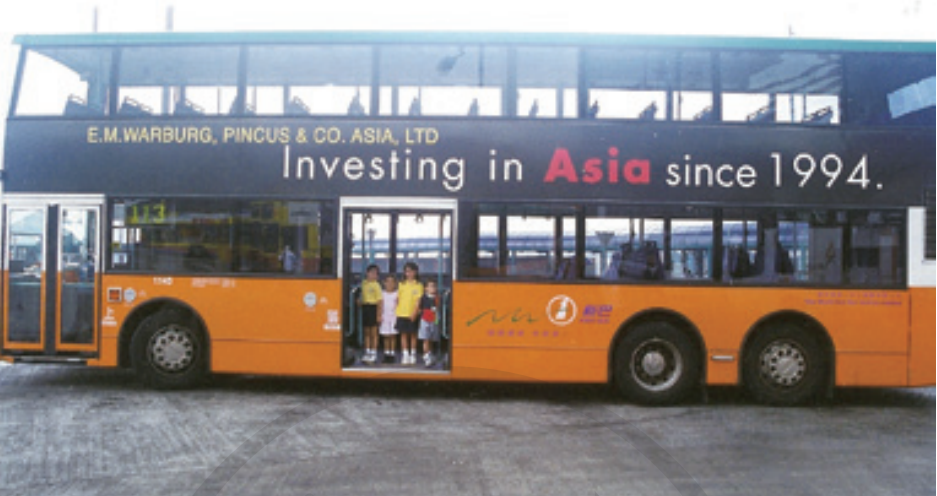 正在我一筹莫展的时候,机遇奇迹般出现在我面前:我前不久结识的法裔金融家保罗·乐泊克(Paul Lepercq)答应为我提供全额奖学金。我简直不敢相信自己的运气,也暗下决心毕业后为乐泊克效力。1992年,我在乐泊克工作期间回国探亲,受到内地改革开放的感召,搬到香港,加入高盛,从事投资银行业务,三年后转做私募投资,在华平一干就是二十年。1996 年华平在香港公交车上的广告