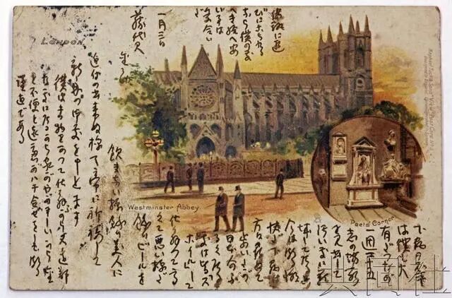 往前倒五年(1900年),夏目漱石抵达伦敦后,寄给同为东京帝国大学毕业的两位留德同窗藤代祯辅和芳贺矢一三张明信片。他与好朋友吐槽:“真受不了这里的坏天气”“英语也一直学不好”,也诉苦“我一个人好寂寞噢”。