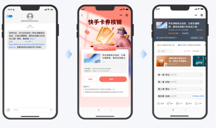 商家朋友们开通快手小店卖货后,可以快速导入快手小店的商品至小鹅通店铺,并关联售卖的商品,用户在快手小店购买后,会自动下发商品兑换短信,商家可实时获取“短信链接点击状态”与“商品兑换状态”。