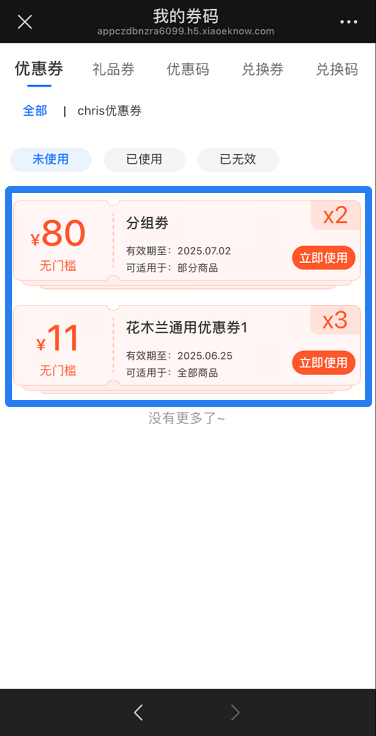 用户端优惠券列表中,同一优惠券、兑换券、礼品券将折叠展示,礼品券与兑换券独立分栏展示,查找、管理更便捷。