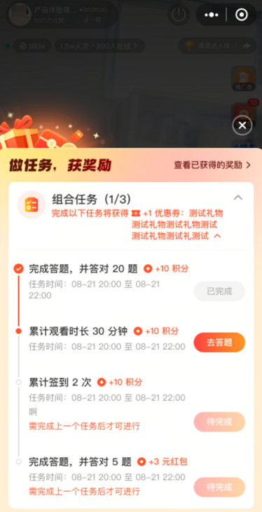 当C端用户任务列表中奖励为优惠券、兑换券、礼品券、奖品时,支持查看奖励中对应展示每种类型的券或奖品的名称。