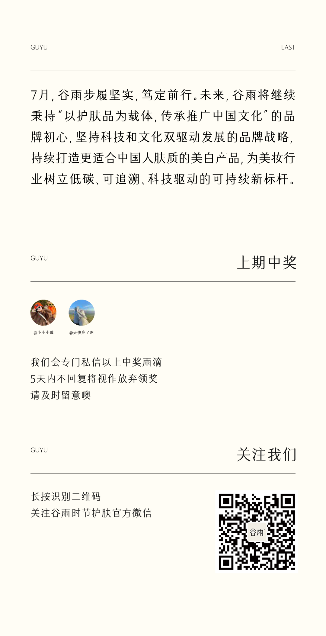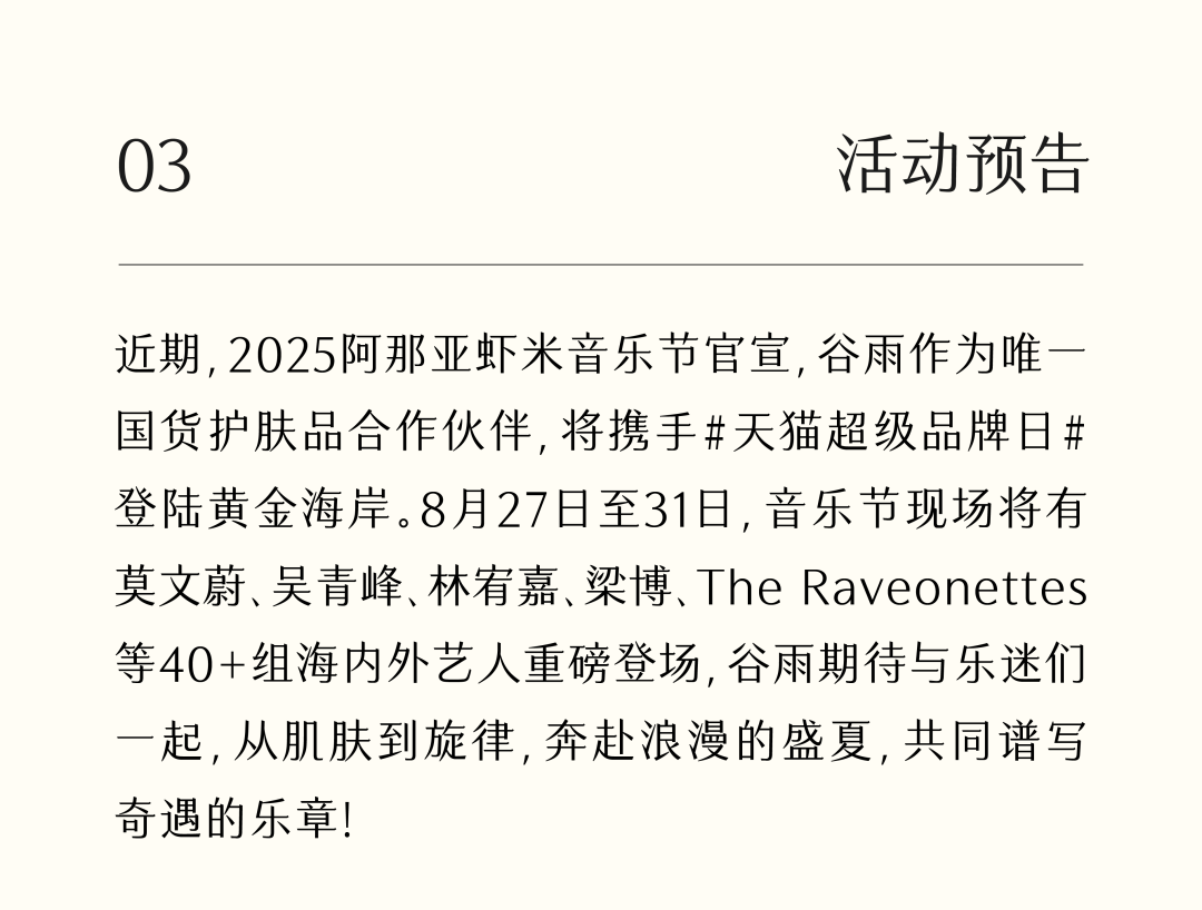 - 谷雨,国内光甘草定美白开拓者和领导者。品牌起源于中国传统的“时节文化”,在深入研究中国人肤质特点的基础上,以创新科技力量,激发珍稀植萃能量,打造中国女性独有的新生白。