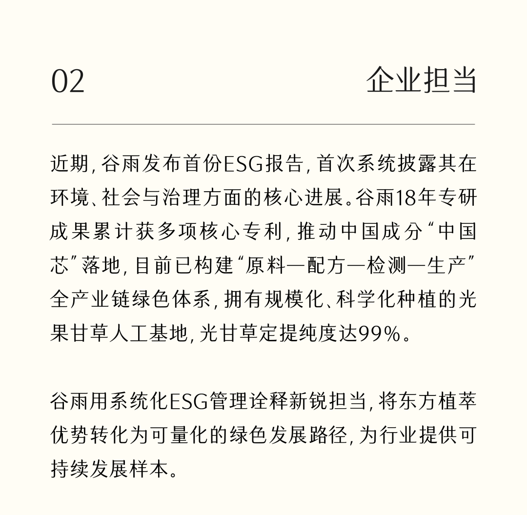 - 谷雨作为更适合中国人肤质的科学美白品牌,相比较于西方化学猛药型成分的刺激,我们更相信东方植萃成分的强大,不仅高效,而且安全,更适合中国人易敏易黑的肤质特点。谷雨专研光甘草定18年,让功效型原料也可以真正拥有“中国芯”。