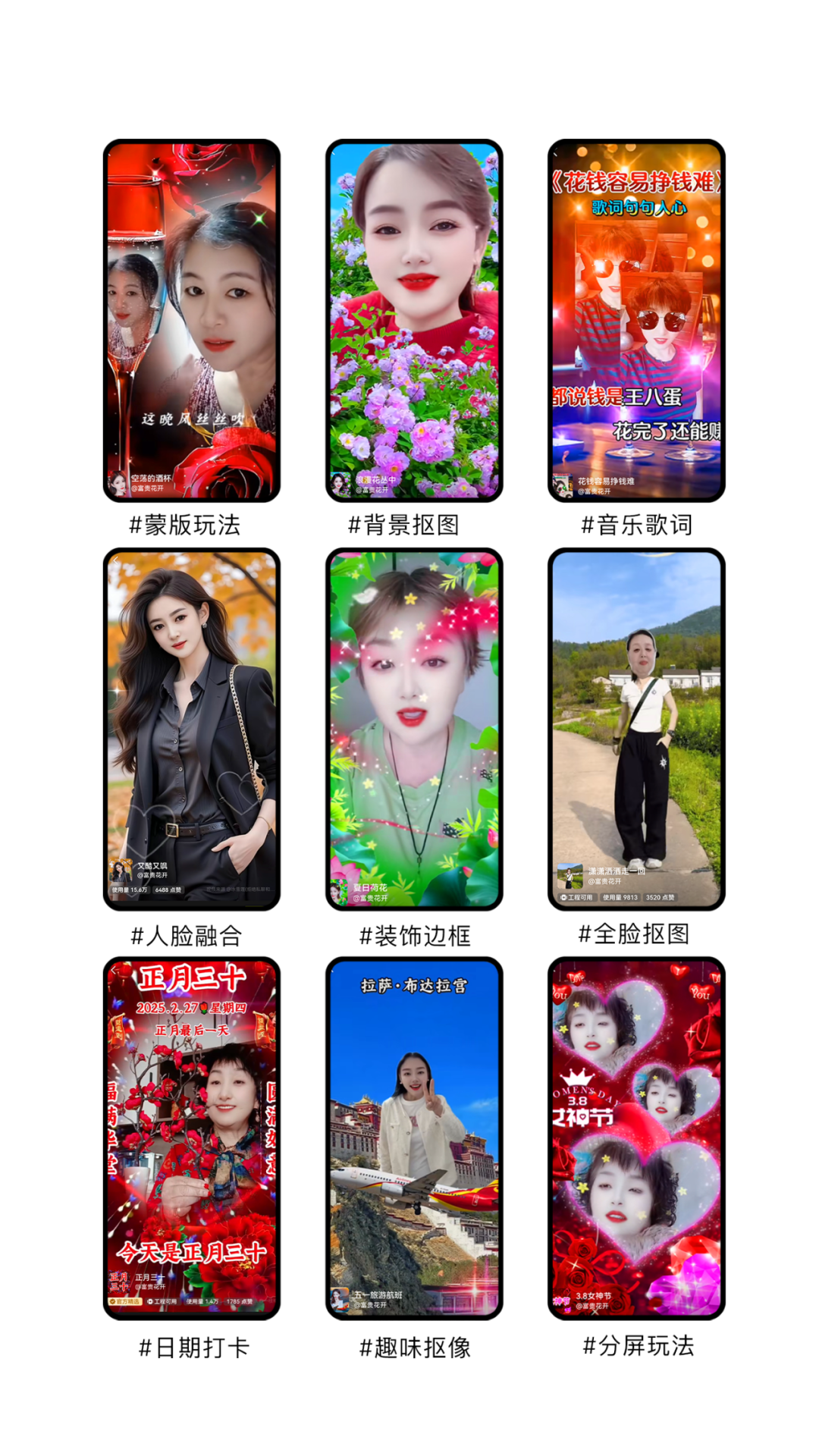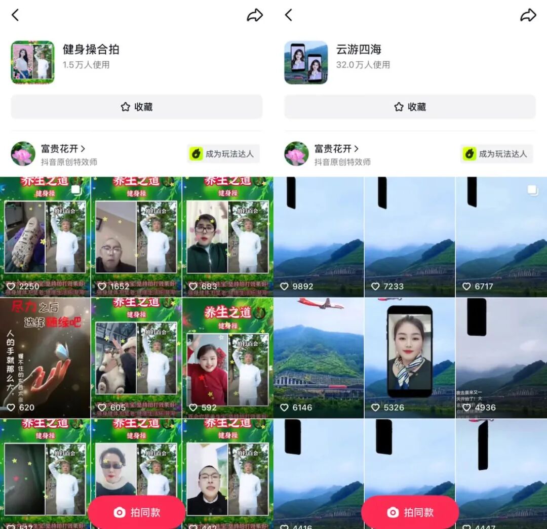 "友友特效是指专门面向中老年用户群体的特效类型,"富贵花开解释道,"他们偏爱高饱和度色彩、传统元素,以及炫彩边框、闪光粒子等。"凭借对这些偏好的精准把握,他创作出 1000 多个等级特效,收获 1.7 万粉丝,特效累计播放 9.8 亿,使用量达 3500 多万。