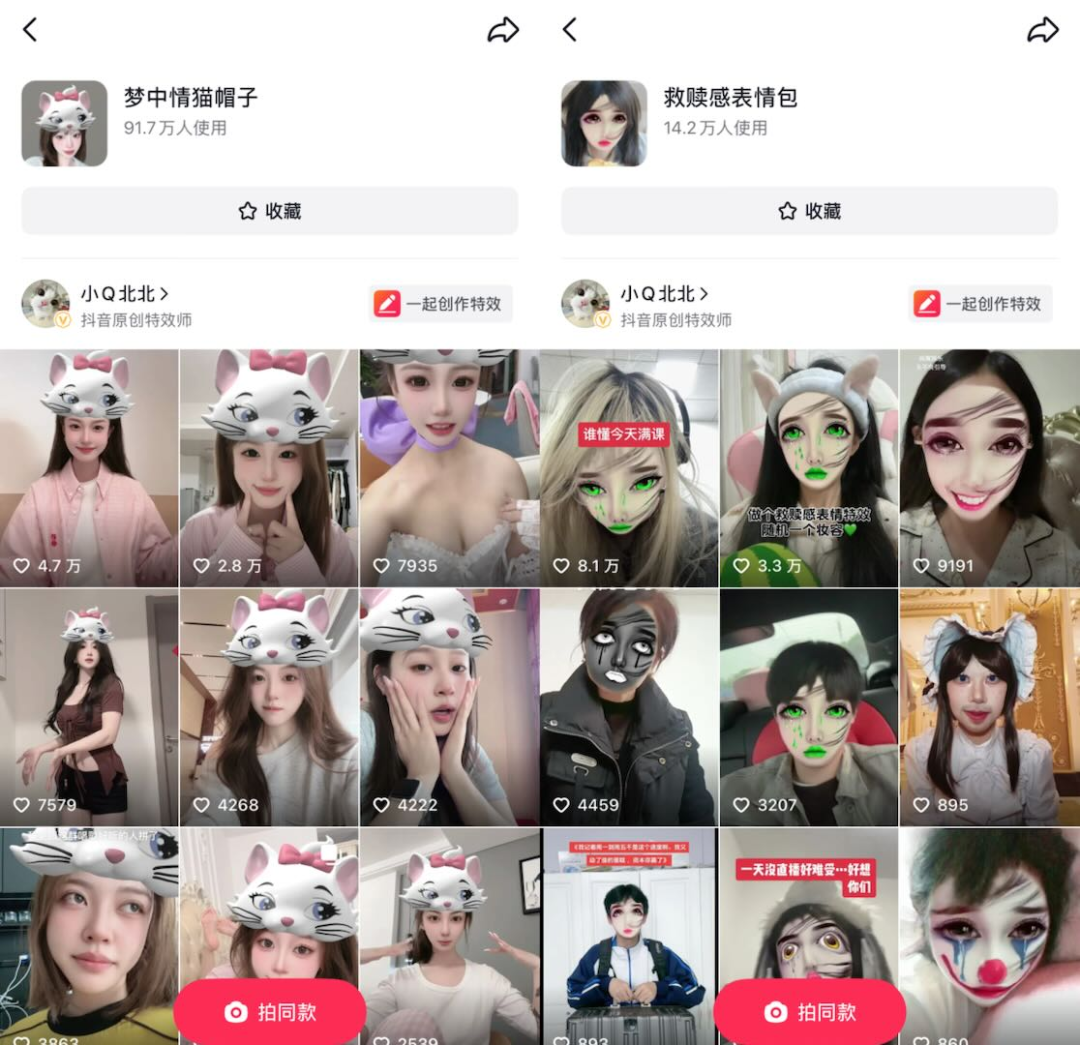 小 Q 北北的代表作《梦中情猫》帽子特效,源于一个简单却深刻的洞察:"疫情期间,很多人和我一样需要治愈。"这款蹭上汤姆猫热点的特效,用毛茸茸的猫耳和俏皮动画,为宅家用户带来温暖陪伴。