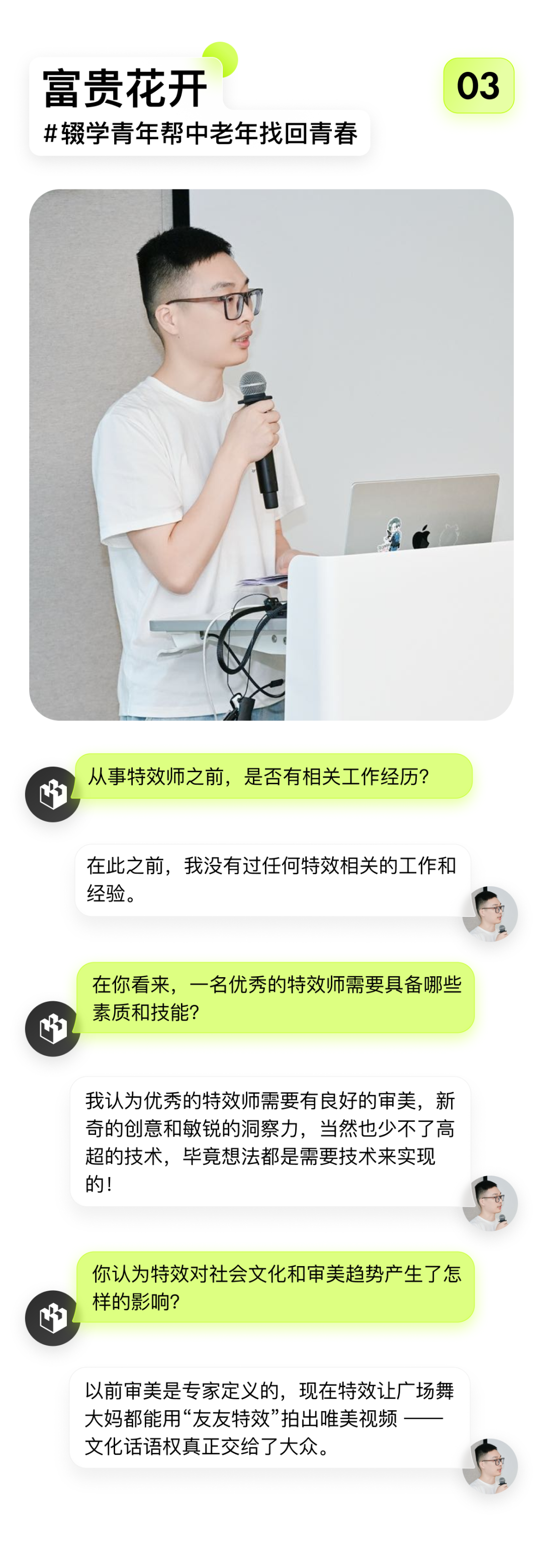 提及到自己的创作之路,富贵花开介绍到:"高中毕业只读了一年职专就辍学回了老家,接触特效时完全是 0 基础!"但正是这种"草根"背景,让他对中老年用户群体——"友友"们的喜好有着天然的敏感。
