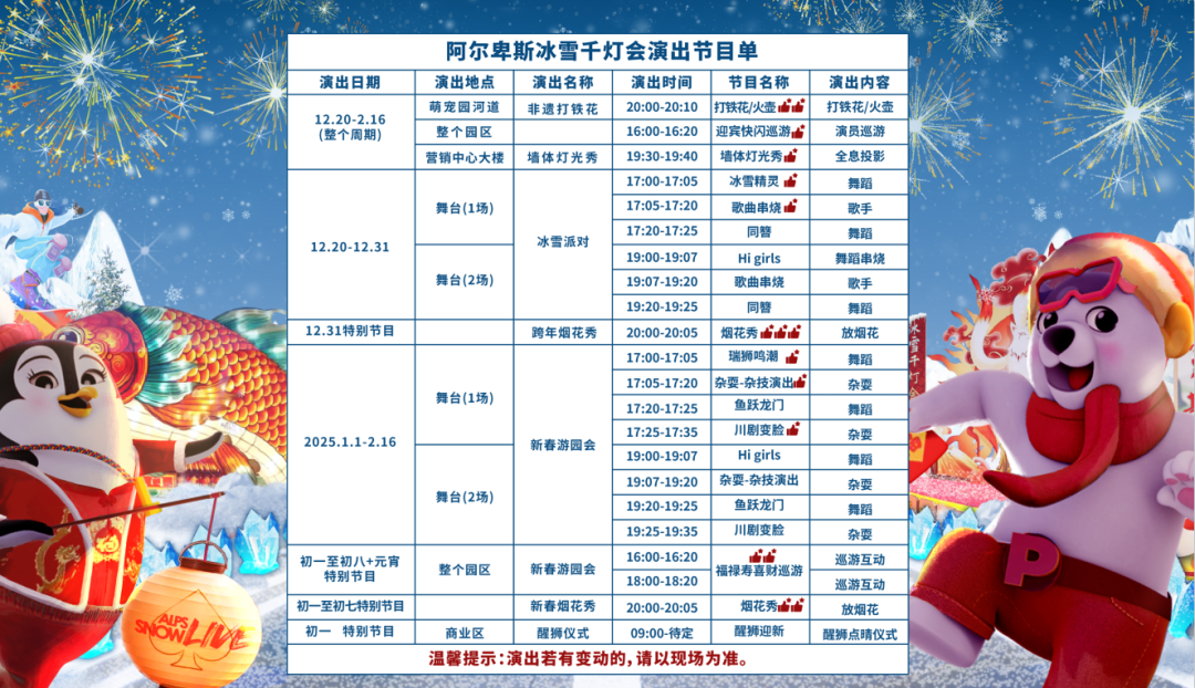 【适应范围】阿尔卑斯度假区内灯会:游园各式彩灯打卡、各类演出、烟花、表演等观看(请以活动当日线下实际为准)不包含雪世界门票、景区内餐饮、停车等消费项目。