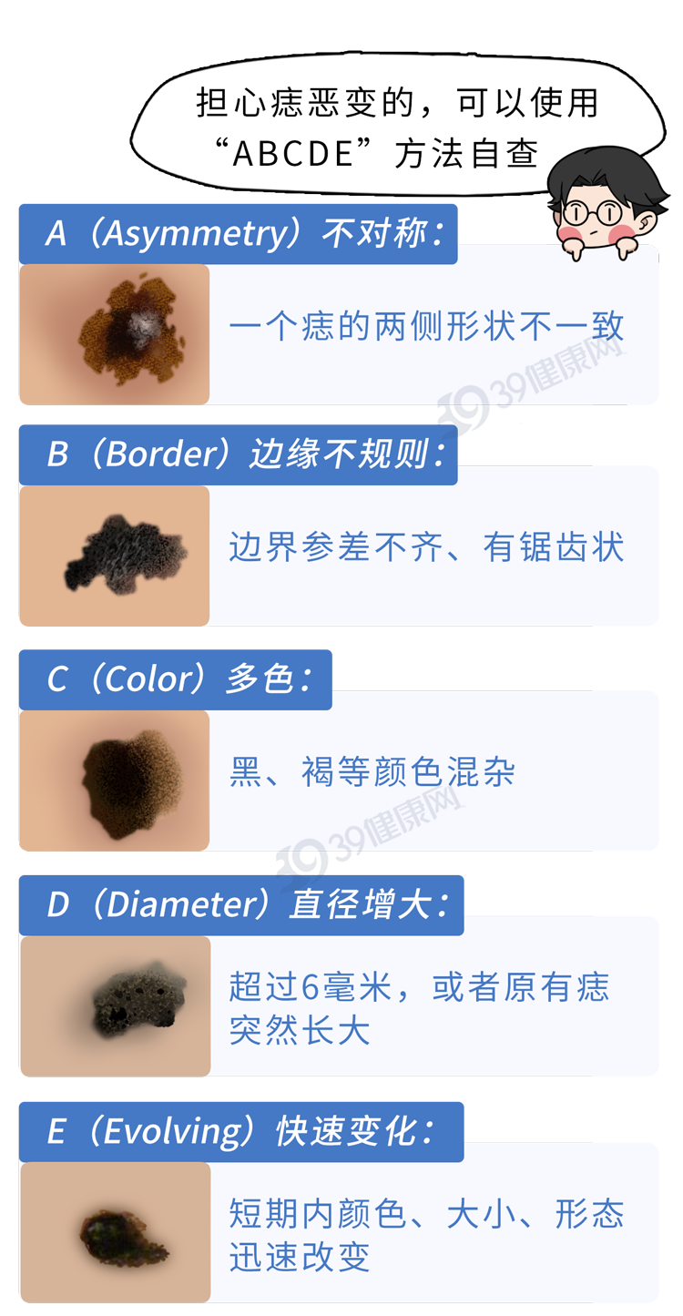 想要预防这种黑痣恶变,日常要做好物理和化学防晒,尽量穿戴防晒衣帽,涂抹防晒霜。同时注意不要手欠去抠身上的痣,反复刮擦刺激可能会增加恶变概率。