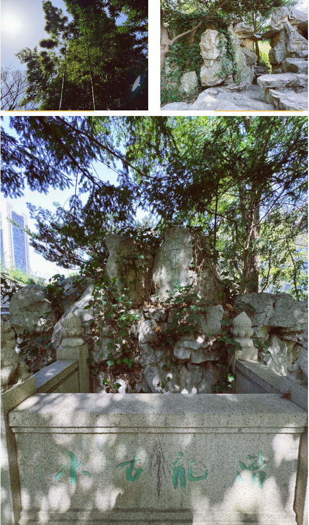 园内半亩池塘,水光返影、绿柳如烟、曲桥浮水,池中小岛古松掩映、怪石峥嵘,岸边粉墙翠竹、鉴亭凌波。