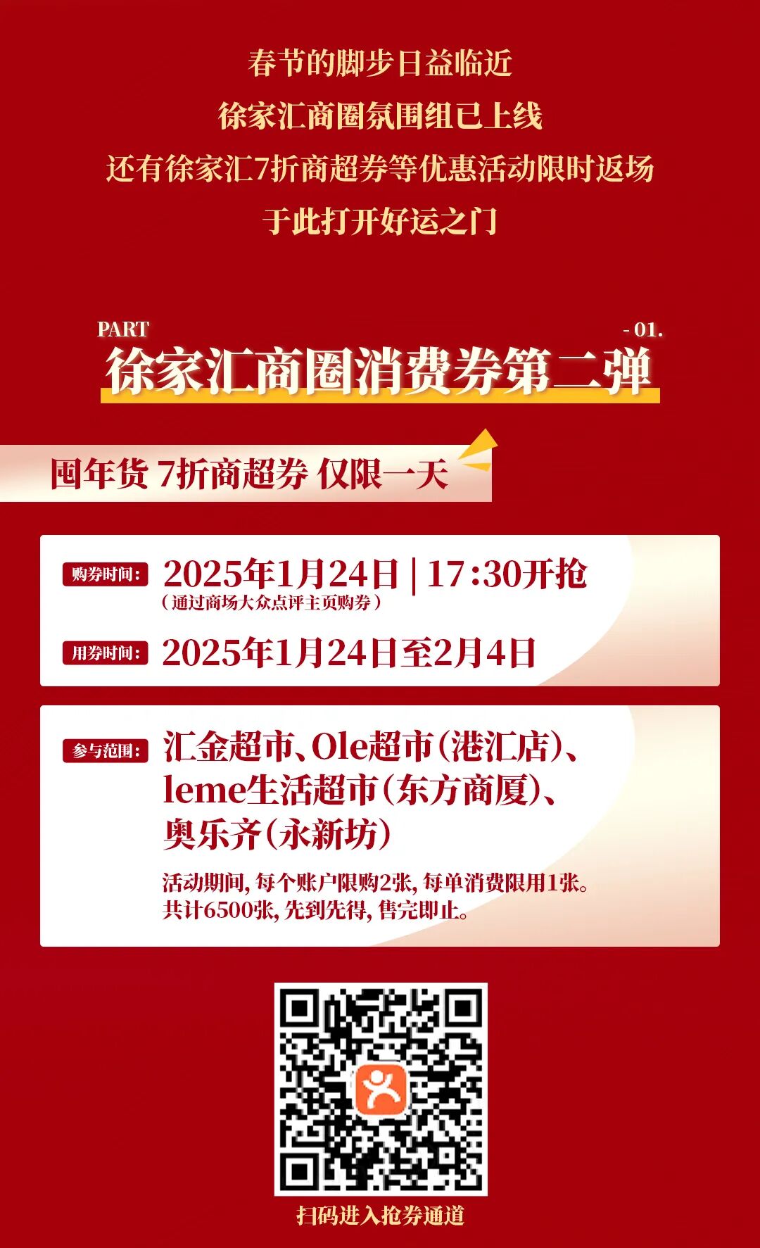 浦东新区新闻办介绍,为贯彻落实国家和上海“提振消费专项行动”相关部署,浦东新区决定开展“2025年浦东新春嘉年华”活动。活动期间,额外追加2000万元资金用于投放第三轮第四批“乐享浦东”餐饮消费券,发放时间为今天(1月24日)上午11:00。