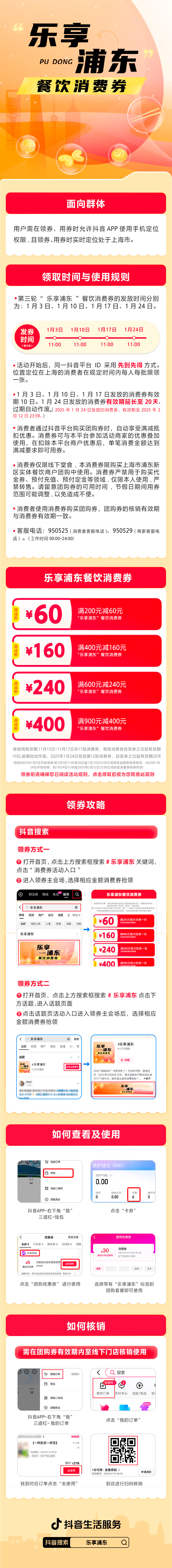 抖音APP:可在“我的订单 - 卡券红包”点击消费券查看,也可在搜索框搜索意向商户,如果商户团购券带有“乐享浦东”或“浦东专用餐饮券”标签,即可下单抵扣。