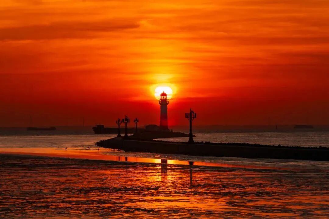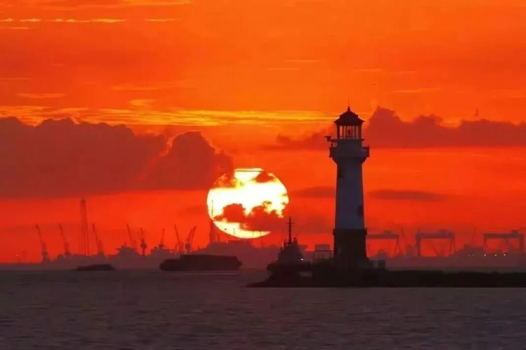 在天空相对晴朗且能见度良好的气象条件下,长江、黄浦江、蕰藻浜三江交汇,为吴淞口提供了观赏日出的独特自然禀赋。6公里滨江岸线、国际邮轮港、大江大河的宽阔水面,让这里的日出景色尤为壮丽。