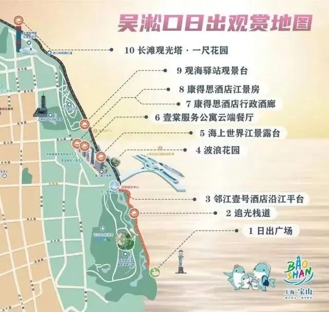 有了观赏日出的指数,那么在哪里才是最佳视角呢?宝山也贴心地给出了推荐点位。上海国际邮轮旅游度假区介绍,为更好满足市民吴淞口观日需求,特别推出了吴淞口日出十大观赏点。