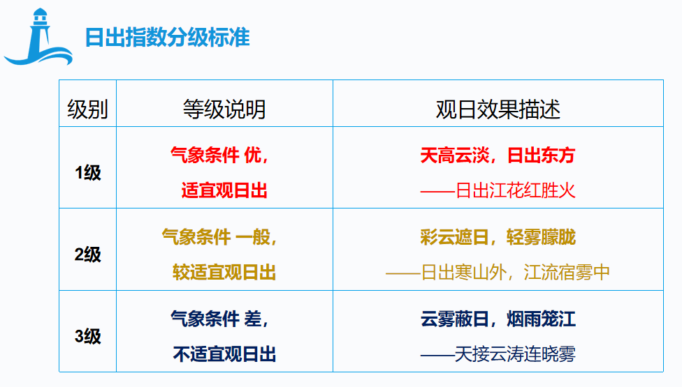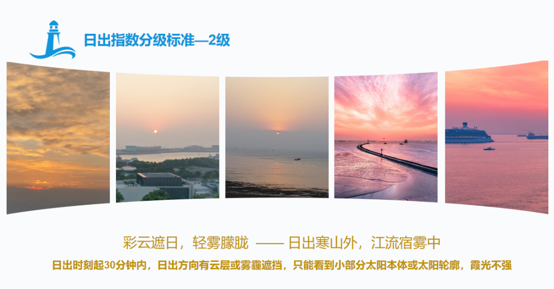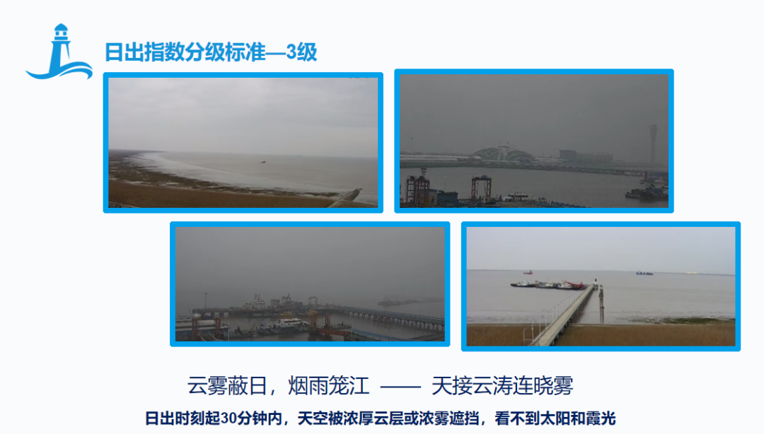 为了提升游客的日出观赏体验,宝山区气象局研讨推出了“吴淞口日出指数”,将日出观赏条件划分为三个等级: