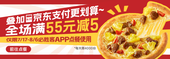 本活动自2025年7月17日至2025年8月6日期间,必胜客会员使用必胜客APP点餐消费,单笔订单实际支付金额满55元(含配送费及包装费) ,每天前4000单可通过京东APP使用京东支付享立减5元优惠,超出4000单后可享0.01~10元随机立减,同一用户活动期间限参与1次。活动补贴共420,000元,用完即止。同一京东号、同一手机号码、同一银行卡号、同一身份证号码、同一手机设备,符合其中一个条件视为同一用户。