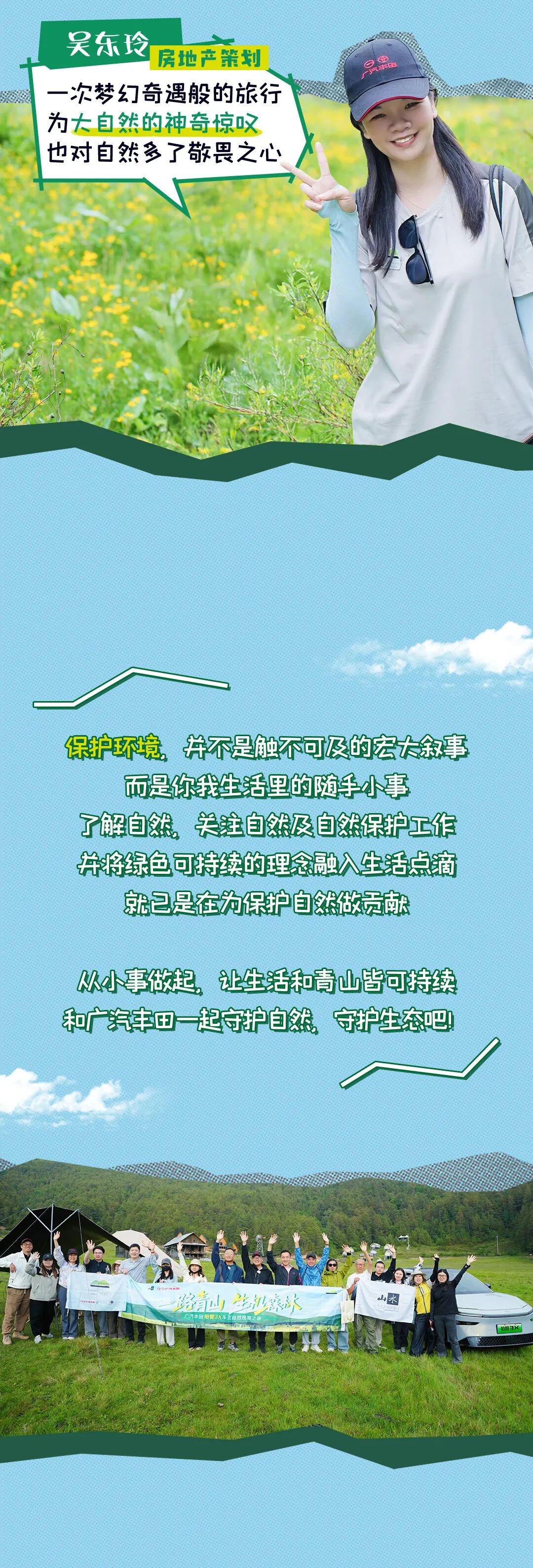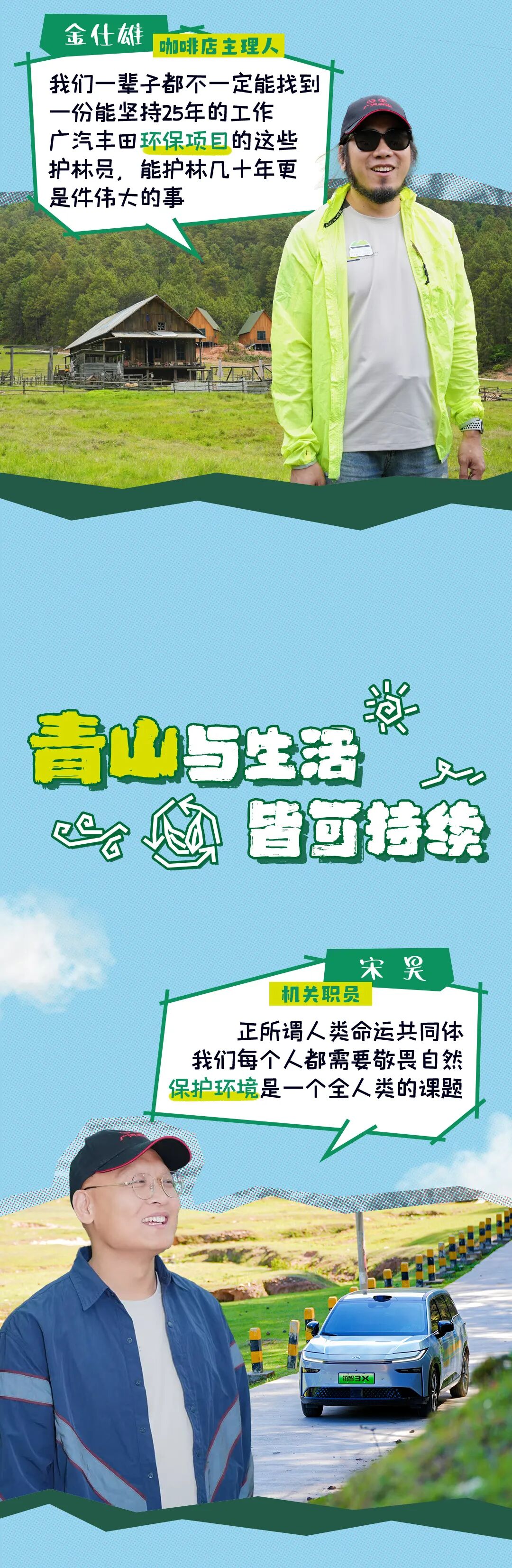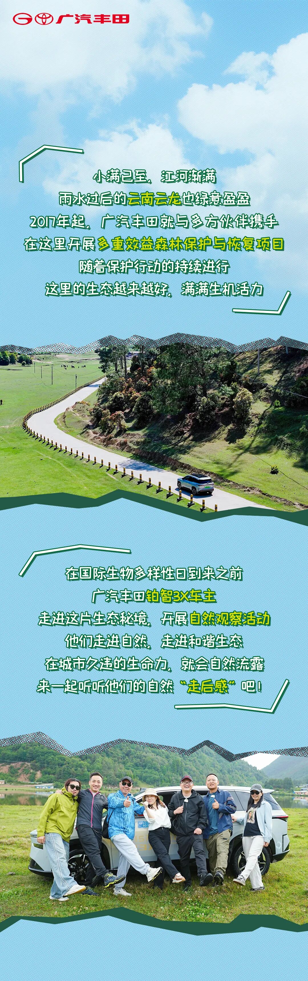 2017年5月起,广汽丰田携手中国绿化基金会、山水自然保护中心等多方合作伙伴,在云南云龙天池国家级自然保护区持续开展多重效益森林保护与恢复项目。2020年开始,项目拓展至云南香格里拉那仁、普洱孟连社区保护地、藏东南墨脱地区和四川关坝社区保护地,与当地巡护员们携手开展生物多样性保护计划,维护濒危野生动物的生存环境,恢复森林生态系统的完整性,并积极推动公众了解身边的生物多样性和创造参与生物多样性保护的可能,共同践行人与自然和谐共生的理念。