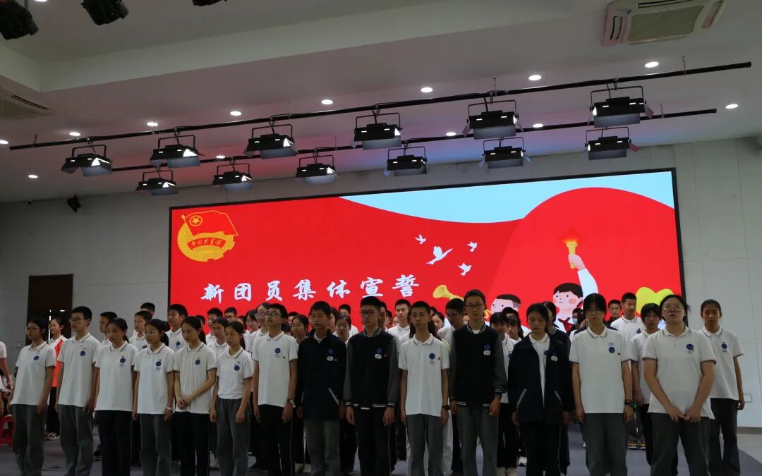 青春启航,团委书记陈丹燕老师宣读新团员名单。老师们为新团员代表佩戴上闪亮的团徽,并在鲜红的团旗下庄严宣誓,立下奋进新时代,担当强国任的青春誓言!