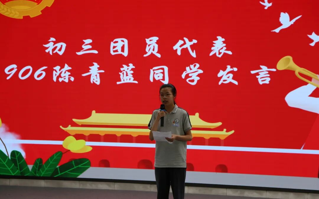 906陈青蓝同学作为老团员代表分享成长感悟,传递责任与担当。810冯熙雯代表新团员庄严承诺,接过奋斗接力棒,以榜样力量,践行入团誓言,续写共青团的辉煌篇章。