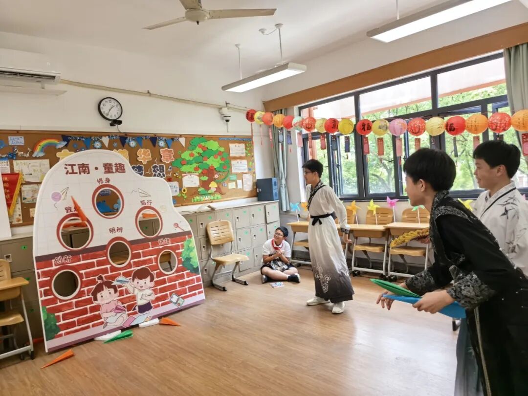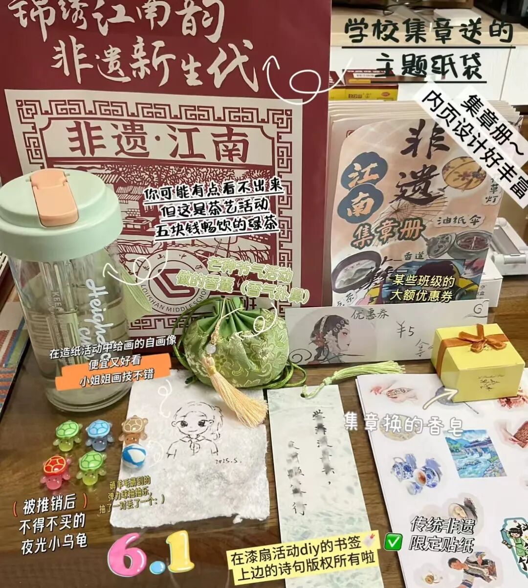 六一新生代非遗主题游园活动~27个班级各举办一个非遗的活动,可以卖展品,表演……这次不仅尝到了传统美食,品了茶,做了传统手工,集章的印章每个班也是各有创意。还有一群穿古装的漂亮小哥哥帅气小姐姐。大家也是各显神通开始推销啦,街上到处的“走一走看一看了”,还有古筝点歌,24点对弈之类的新奇招客活动,每个班的教室也是各有巧思的布置,感觉自己置身的不是学校而是一个江南小镇的集市上~