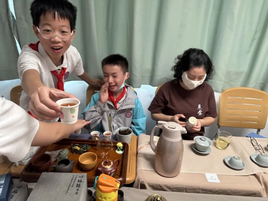 走廊尽头茶香四溢,绿茶,红茶,花茶,有志愿者用专业的沏茶手法,让同学们品尝一杯杯热茶的清甜。一杯下肚,回甘无穷,正是千年来的传统茶艺。