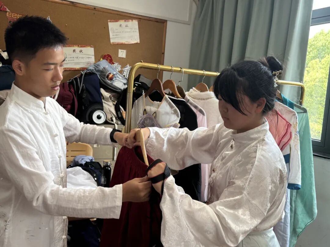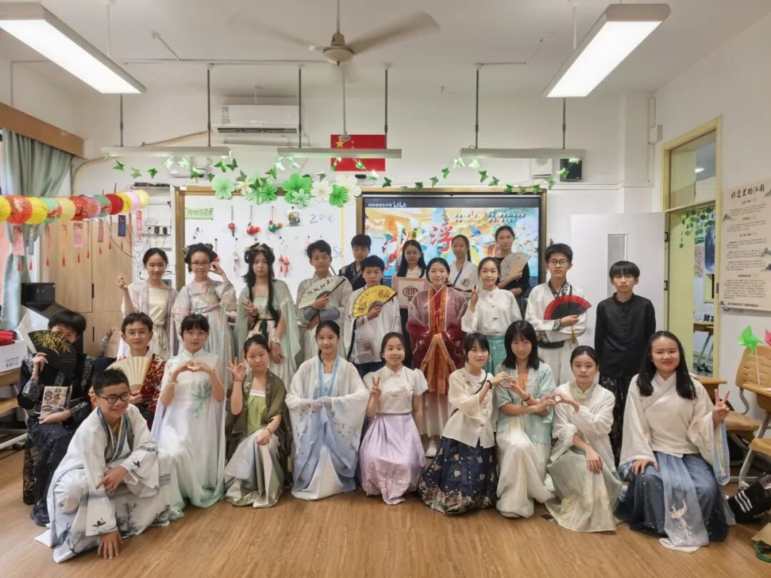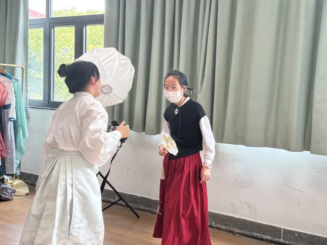 七(4)教室则化身“汉服文化体验馆”,同学们穿上精致的汉服,仿佛穿越回了古代,他们在专业的摄影设备下,摆出各类古典姿势,定格优雅瞬间。此外,班级还设置了“汉服书签制作”体验区,同学们用古风贴纸、流苏等材料,亲手制作独具韵味的汉服书签,感受传统服饰的文化内涵。