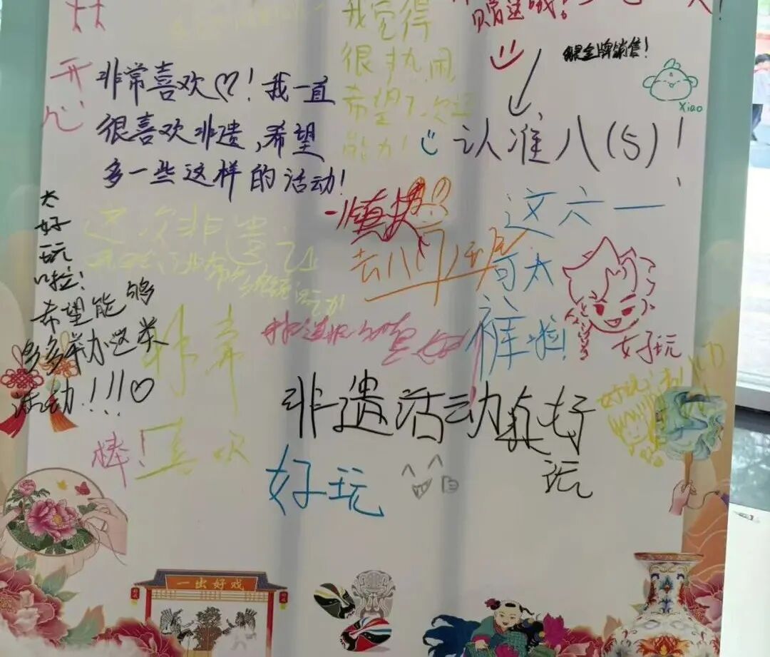 在保留公益内核的同时,此次游园活动也希望看到队员们对于非遗传承、策划展览的反思。活动尾声,“非遗创变互动提案墙”前人头攒动,队员们纷纷写下活动感言和“金点子”,争当非遗传承的“小先锋”。