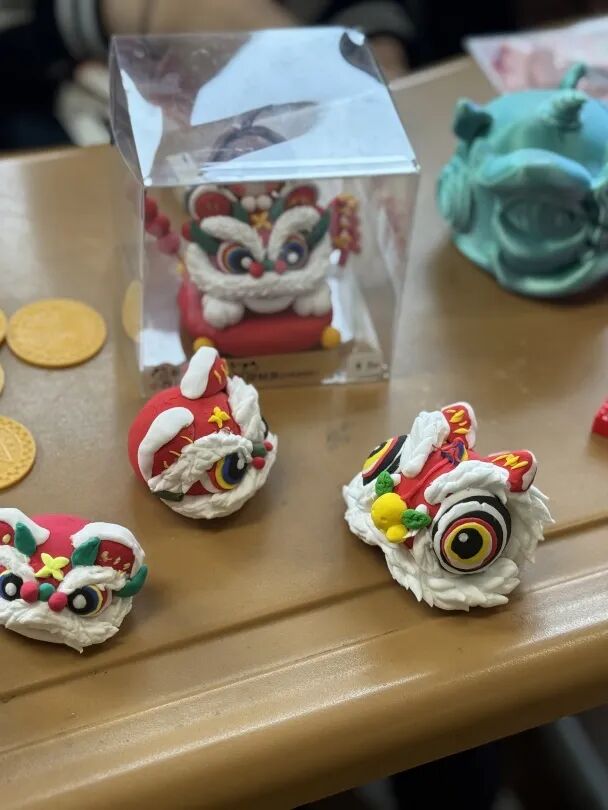 这次活动中,有几个让我印象非常深刻的主题。比如六(4)中队锣鼓喧天,热闹非凡,这里是表演艺术类项目——“舞狮”体验区。同学们手持彩绘狮头,跟随鼓点完成一系列动作,活灵活现地展现了传统舞狮的喜庆与灵动。另一边,手工区里,同学们正用彩色橡皮泥捏制醒狮,狮头的螺旋鬃毛、炯炯有神的眼睛,无不体现着非遗艺术的精巧。