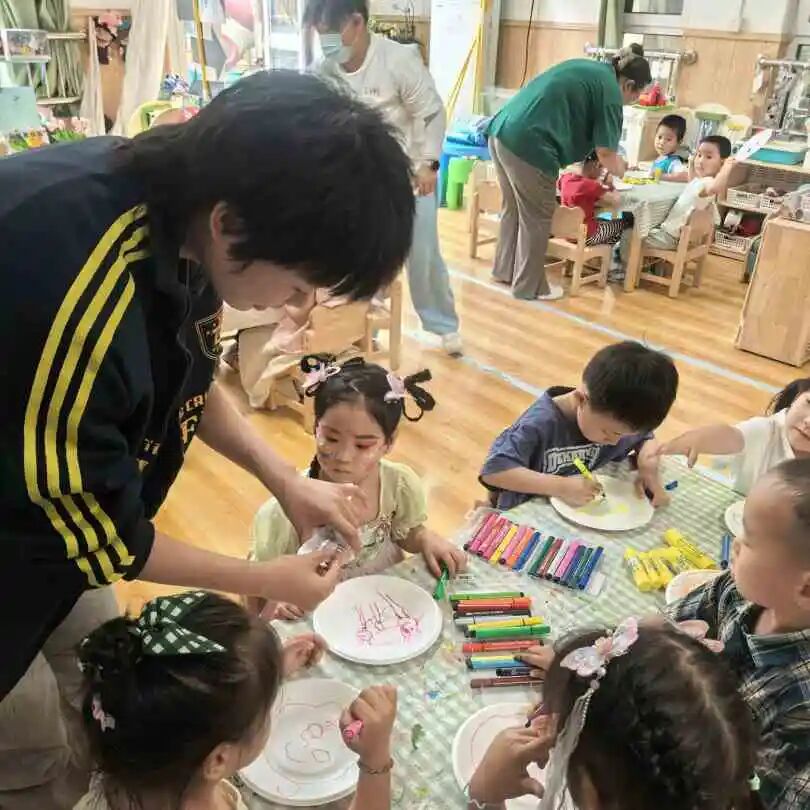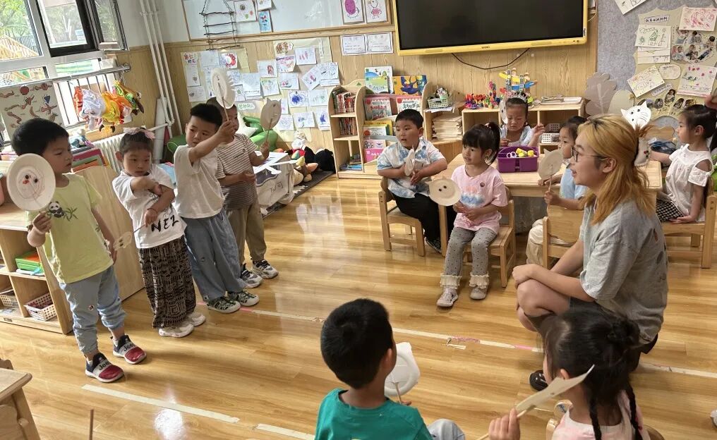 “欢迎你,小猫咪”!当老师轻轻晃动手中的自制木偶,孩子们瞬间张开手指模仿起来。在“动物朋友来做客”课堂上,小萌娃通过身体魔法学习控制与表达:手掌蜷曲变成小刺猬滚过草地,手指张开化作孔雀开屏。最神奇的是一次性餐盘变身术——画上喜欢的小动物,拿在手上就成了会对话的木偶朋友。“小猫咪请喝水。”孩子们轮流照顾玩偶伙伴,合作意识在童趣中悄然生长。