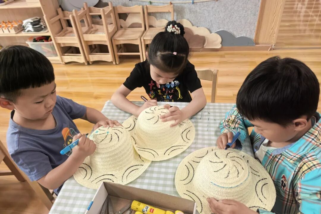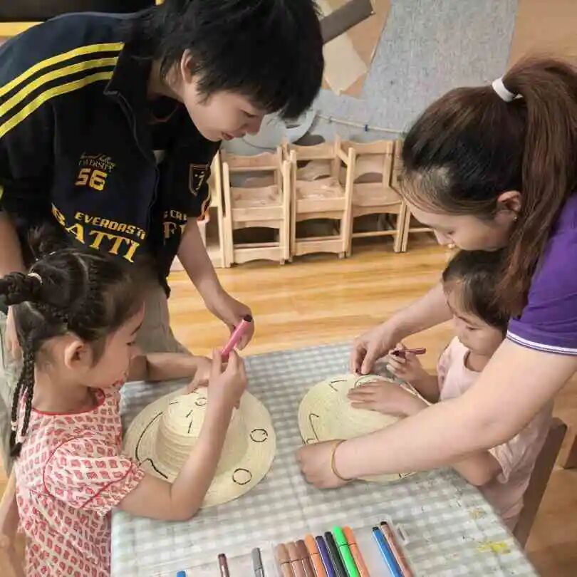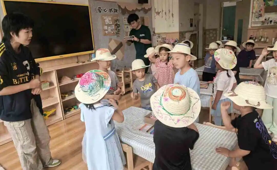 草帽变身魔法帽!当“受伤的小熊”出现在场景中,中班孩子化身森林守护者,自发组成救援小队,用颜料在草帽上画出不同的纹路与图腾,带上自制“救援帽”做拯救森林 的小英雄。“别怕,我们带你去安全的地方!”稚嫩的承诺里藏着角色代入的真情实感。这场即兴救援行动,让“责任意识”不再是抽象词汇,而是手心相握的温暖力量。