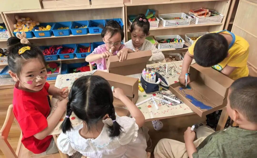 “我的盒子世界有会飞的鱼!”大班孩子用一个个纸盒子搭建出三维剧场。彩泥在指尖化作繁星点点悬浮在棉絮云朵间,水彩笔的线条垂下成为瀑布河流。当孩子们钻进盒子剧场,用不同声线演绎角色对话时,空间想象力与叙事力正在疯狂生长。专注捏制太空乐园的女孩突然欢呼:“看!我的外星人和UFO帅不帅!”