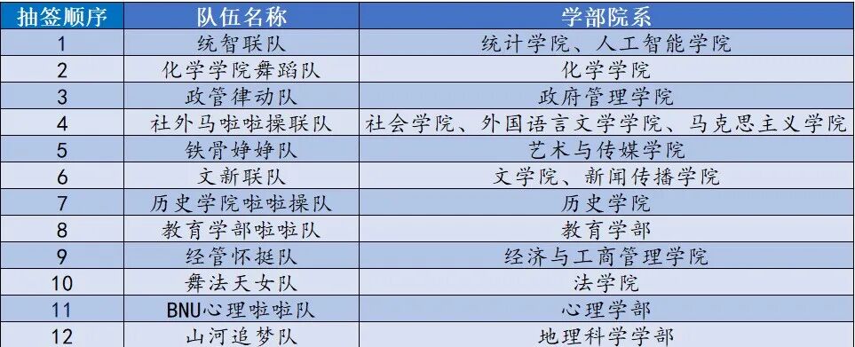 本届比赛共有12支队伍报名参与,以下为抽签情况。预赛结束后,得分最高的六支队伍进入决赛。