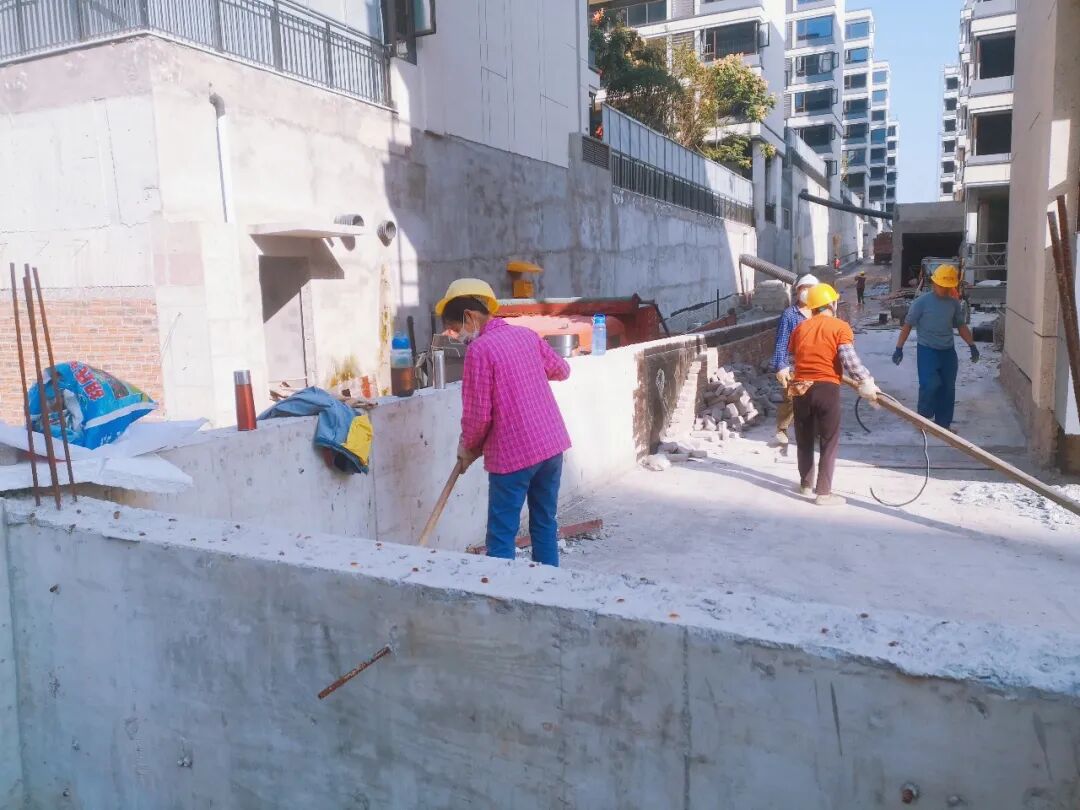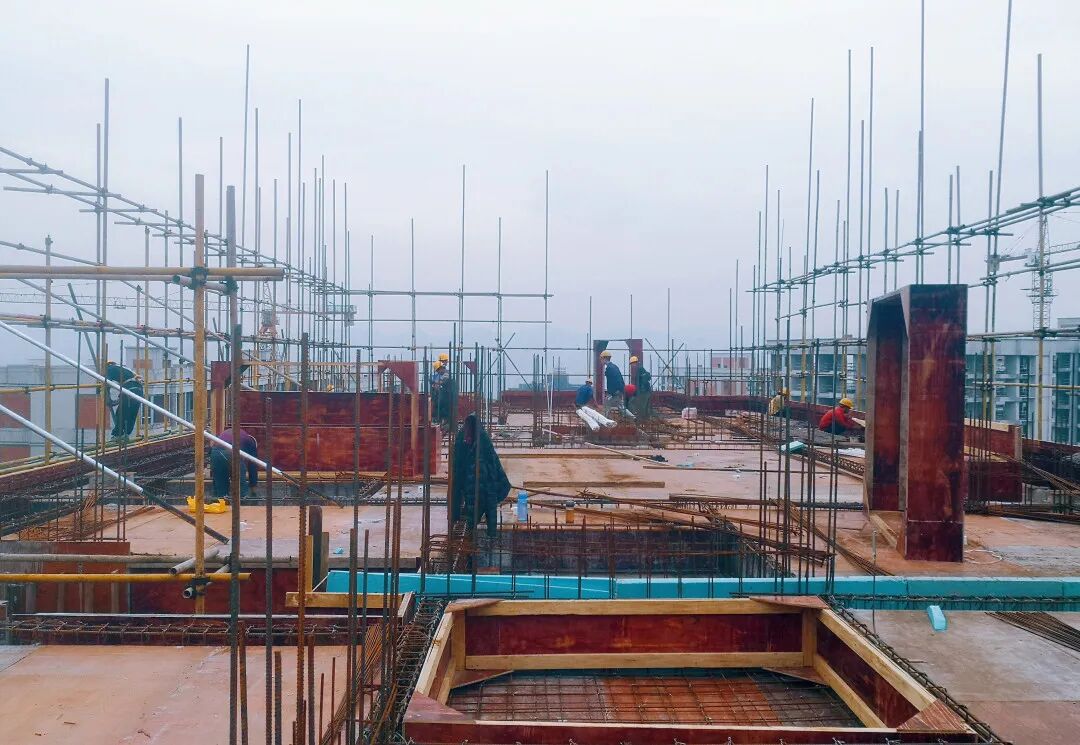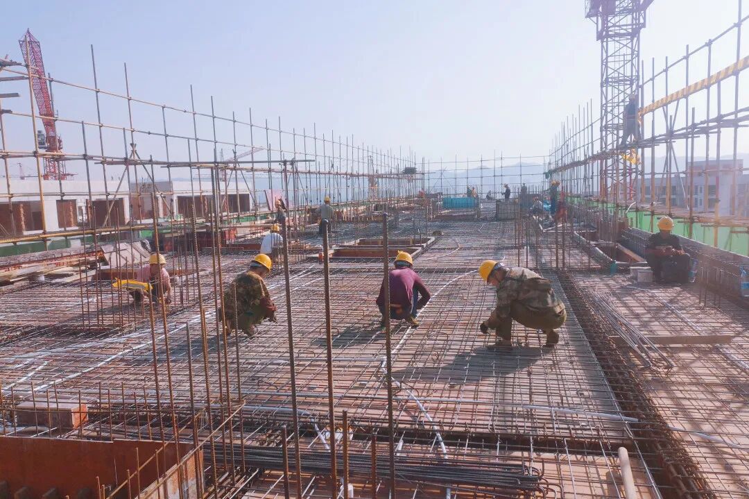 工程笃行不怠,施工有条不紊。针对工期紧、任务重等实际情况,施工单位倒排工期、挂图作战,并定时召开早、晚例会以及全员工作部署大会,针对性解决重点难点施工问题,全力推进项目建设进度。为稳步推进施工进程,项目采取了穿插施工的方式,确保木工、钢筋、混凝土等施工班组流水作业顺畅衔接,为加快施工进度赢得了一定的时间。