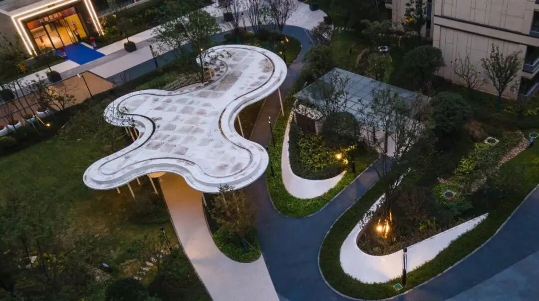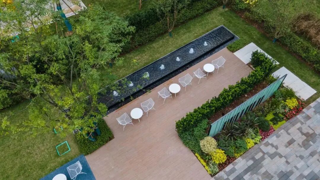 实景园区内,项目便巧借自然之景,融合音乐曲韵,以“高山流水”韵律为核心打造了九韵主题园林。借景墙、特色乔木,打造精致的礼仪迎宾轴线;以山形挡墙、起伏草坪等高低落差设计,层层递进;入口景墙处融入流水、涌泉、叠水、花草等元素,打造寻山问水的意境,营造高雅的住区境地。