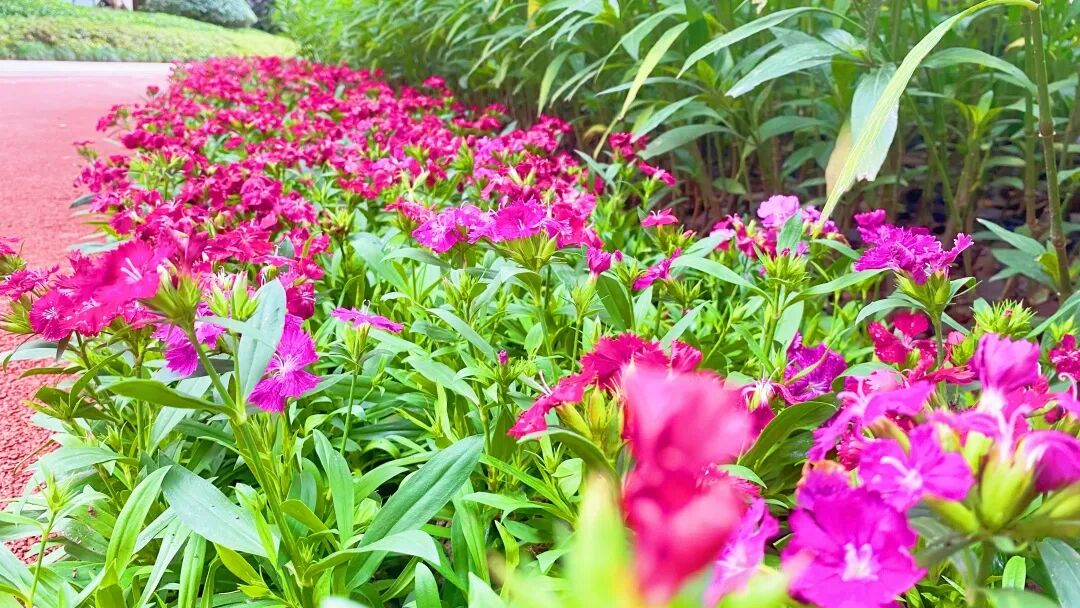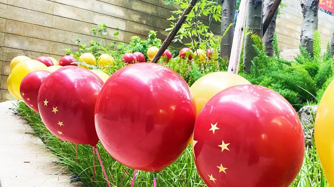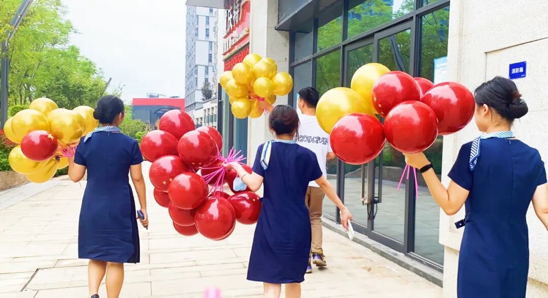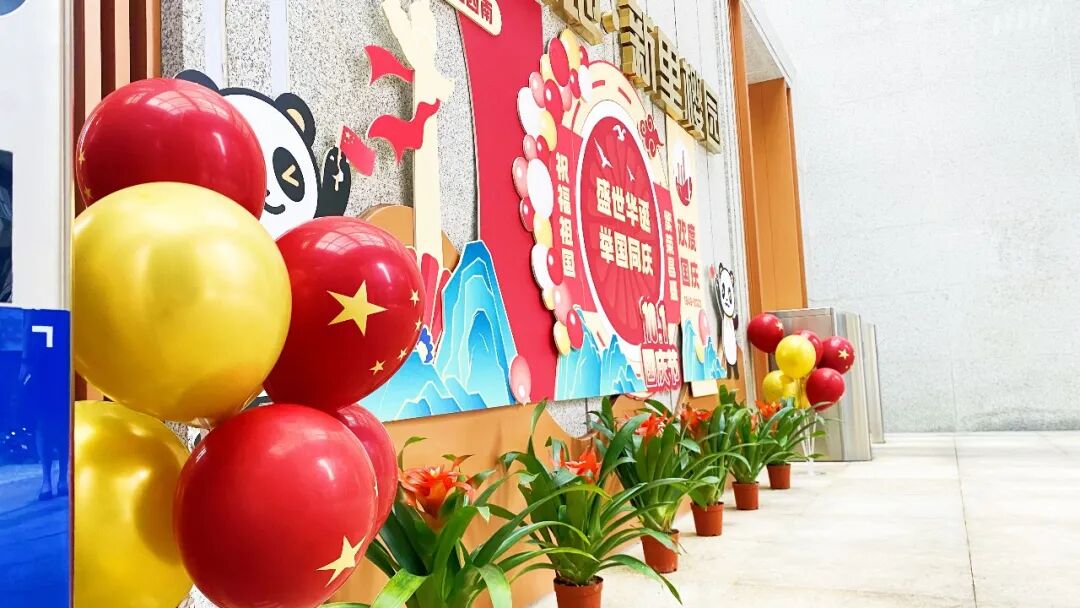 国庆主题画面,搭配争奇斗艳的鲜花、红黄相间的气球,绿地·新里樱园满满的节日氛围。工作人员巧手布置,时令鲜花搭配绚丽的气球,整个园区焕然一新。