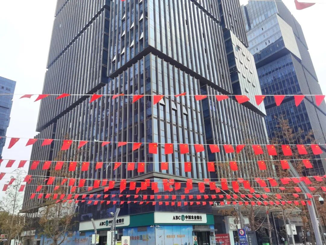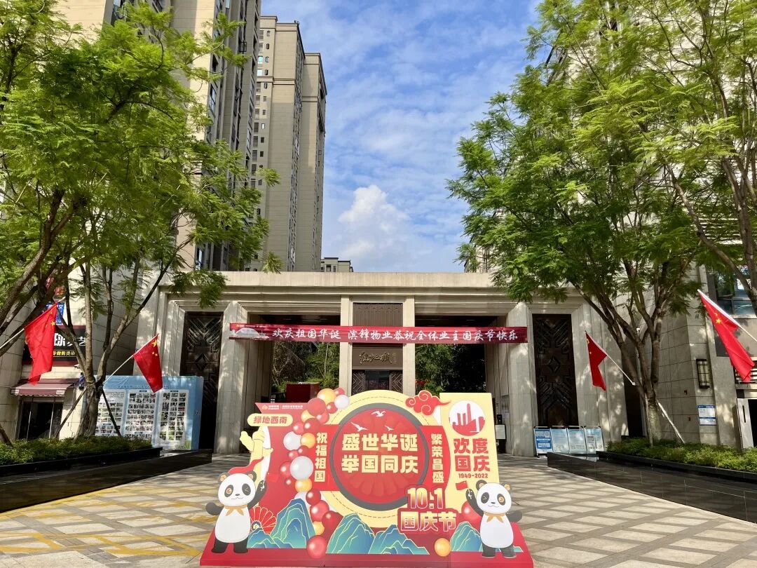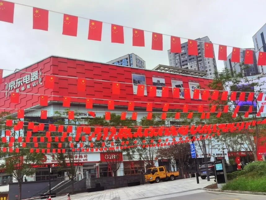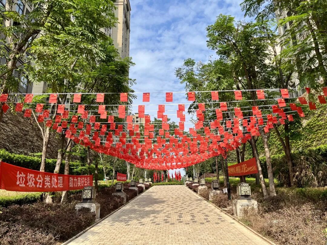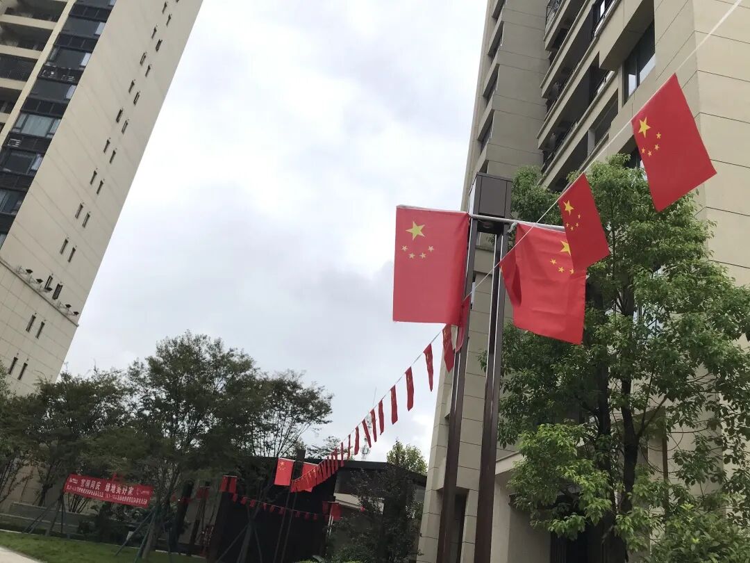 小区大门、景观中庭中,一面面迎风飘扬的五星红旗,在蓝天白云的映衬下,显得格外夺目,给园区增添了节日的色彩。