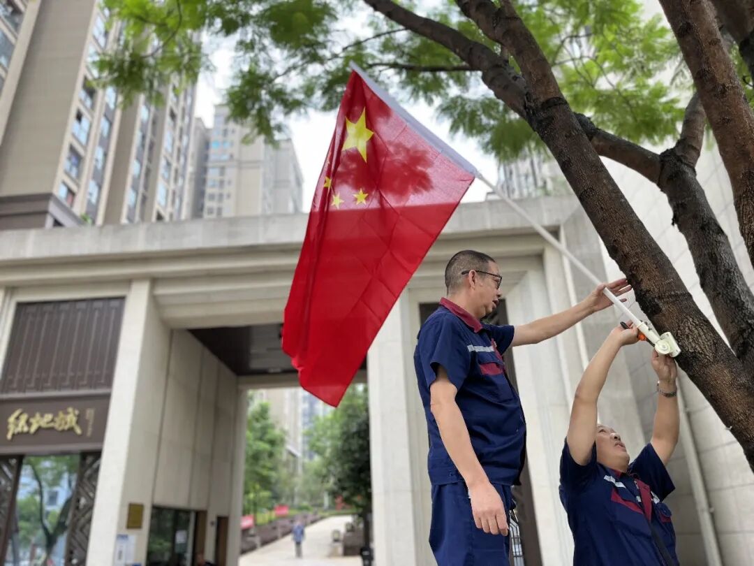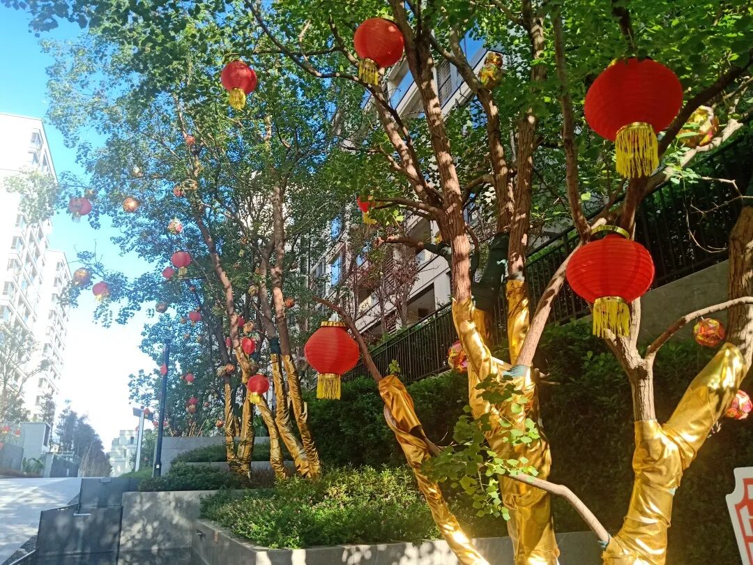 从方案设计、物资采买到设置安装,绿地重庆各项目工作人员爬高梯,穿铁线,高高挂起红旗、灯笼,用心做好每一个细节,为园区换上“新装”。