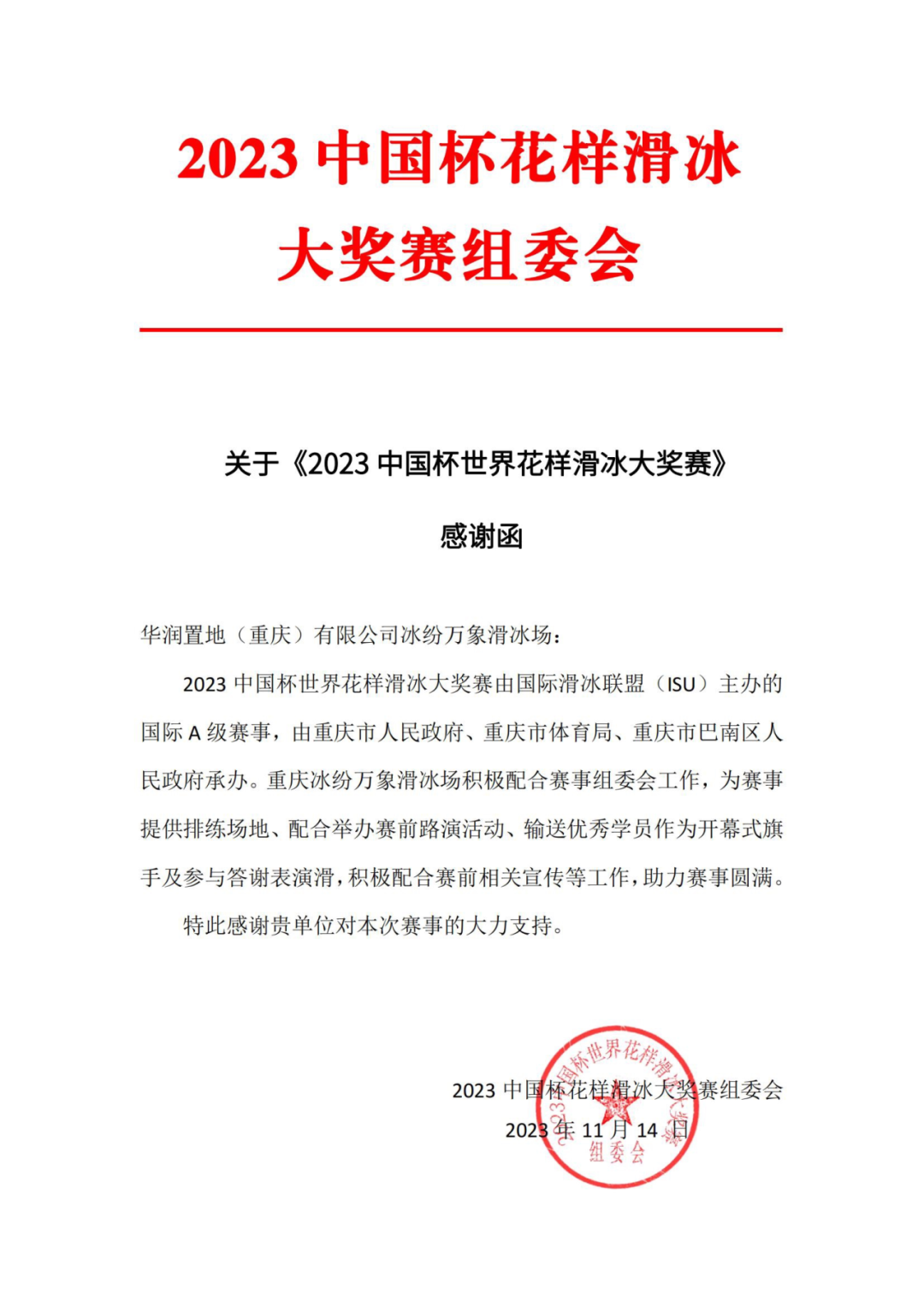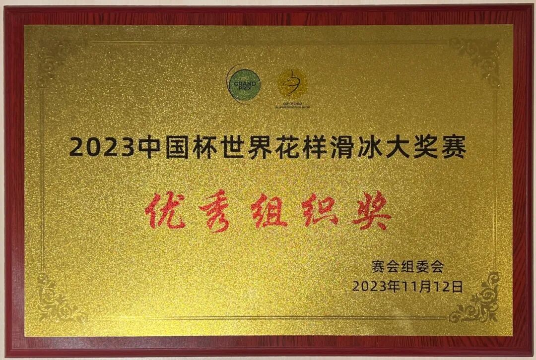 重庆冰纷万象助力中国杯,赛事组委会为重庆冰纷万象滑冰场发来感谢函,并颁发优秀组织奖。