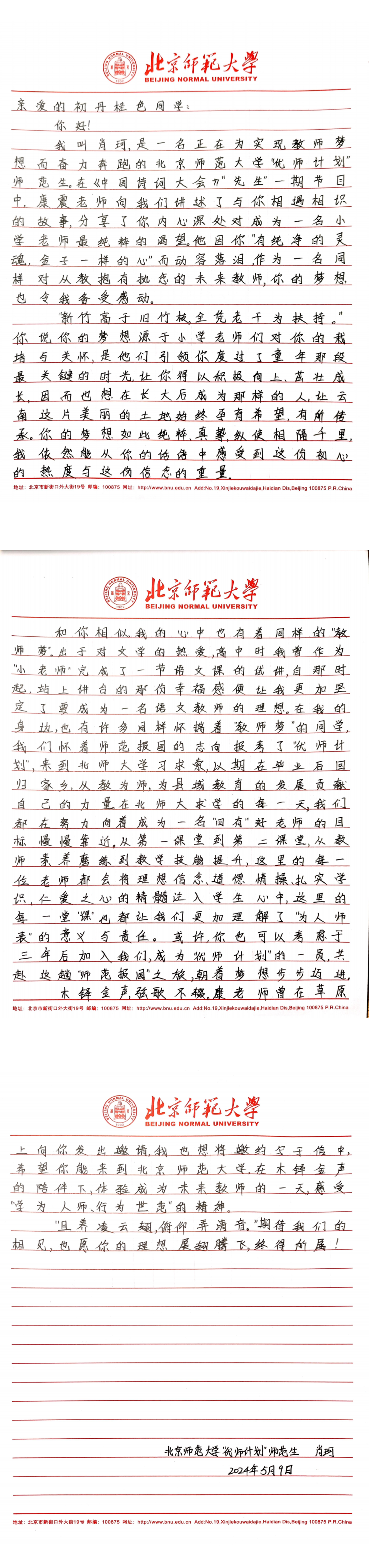 北京师范大学2021级“优师计划”汉语言文学专业师范生肖珂看到节目后深受感动,她给桂色同学写信,邀请桂色同学来到北京师范大学,在木铎金声的陪伴下体验成为未来教师的一天,感受“学为人师、行为世范”的精神。