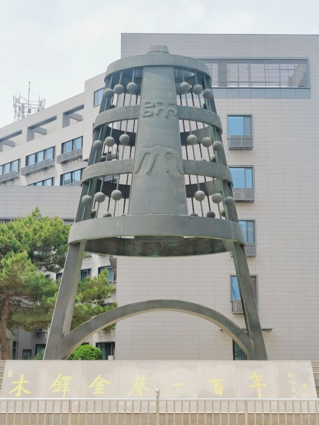 木铎金声,弦歌不辍,木铎自古便是教师的别名,因此木铎对于北师大有着特殊的意义。而这一木铎标志则是北师大百年华诞时所修建,雕塑上部正面铸刻“师大”二字;下方 “木铎金声一百年” 一行字,则由启功先生所题写。北师大的校徽以及无数周边均以此为原型进行创作。