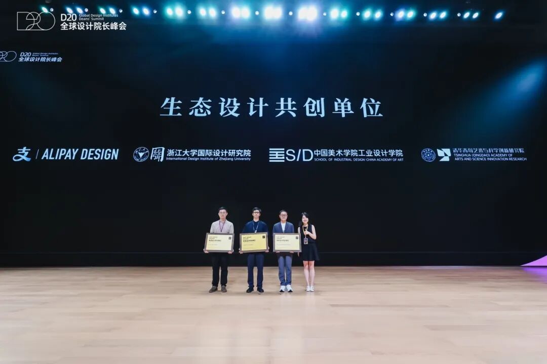 主论坛现场,杜素向第一批生态设计共创伙伴代表 浙江大学国际设计研究院院长 孙凌云、中国美术学院工业设计学院院长 王昀、清华大学美术学院副院长 赵超 颁发生态设计发展计划合作牌匾。
