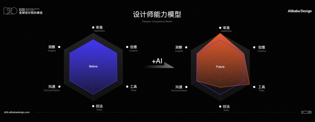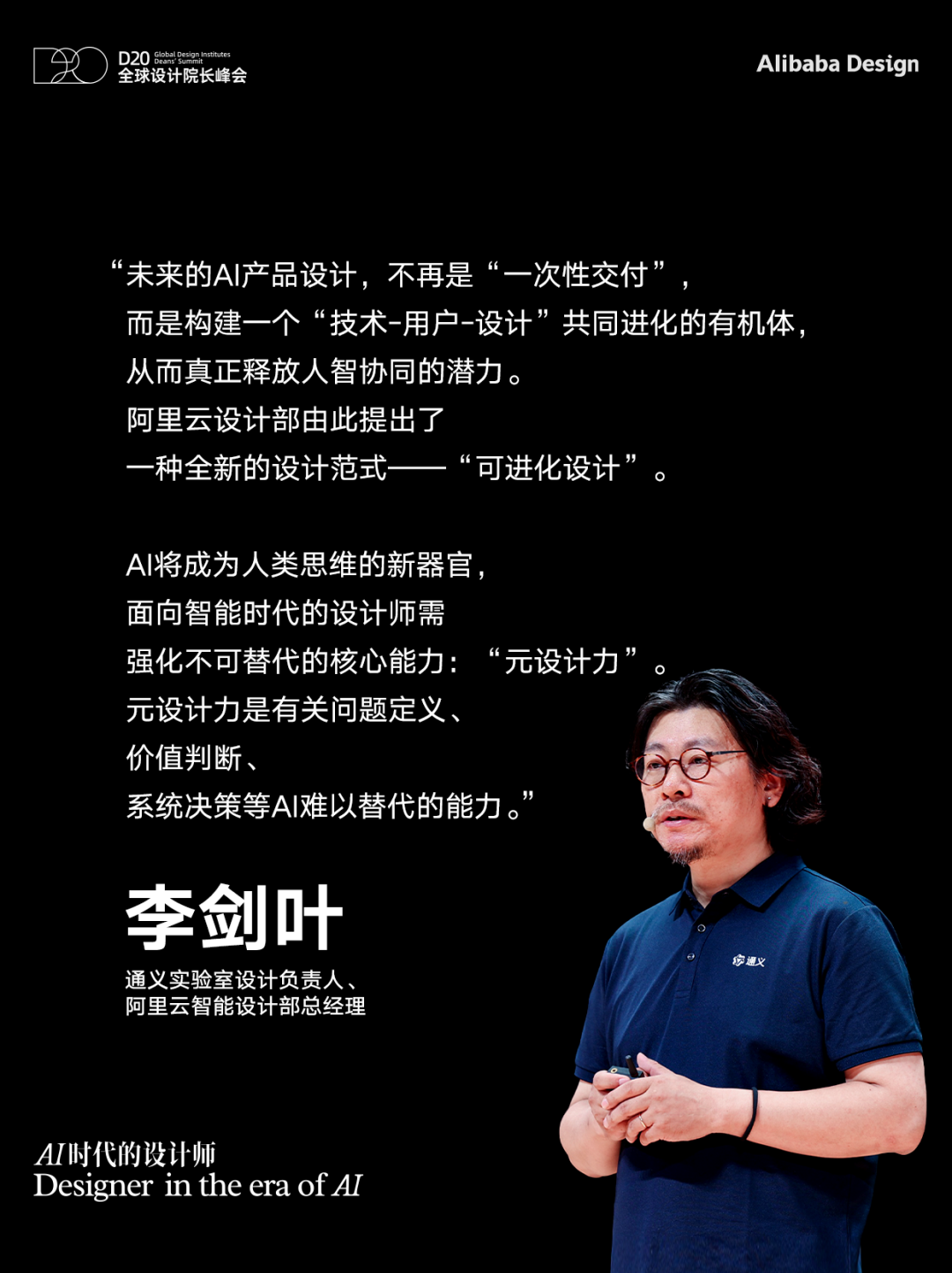 D20峰会,作为全球设计教育与产业实践的顶级对话平台,始终致力于推动设计与科技的跨学科融合。从去年关注“AI时代的设计”,今年主题聚焦“AI时代的设计师”,从探讨技术范式,更聚焦到了用技术的人身上。 “ 每次技术变革,人才供需脱节,也是产学合作定义新质人才的历史机遇。” 现场,阿里国际副总裁、阿里巴巴设计委员会理事长 杨光 透露,阿里设计今年开始推动各个领域AI设计人才标准的共建,帮助院校育人、企业用人。