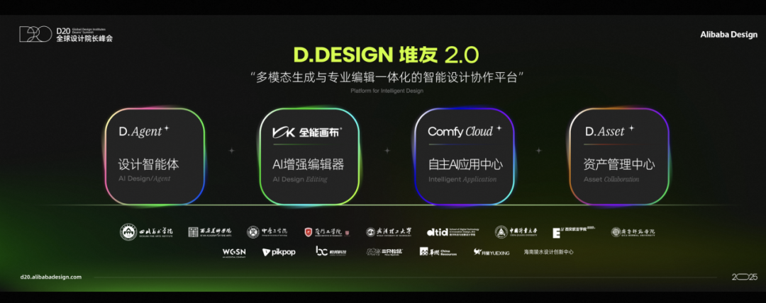 D20 2025 主论坛现场,平台代表、数百位国内外顶尖设计院校院长、全球一线人气AI独角兽负责人、产业代表等,集结成“师”,展开了跨行业、多视角的精彩分享,共同开启了多项重磅成果发布。