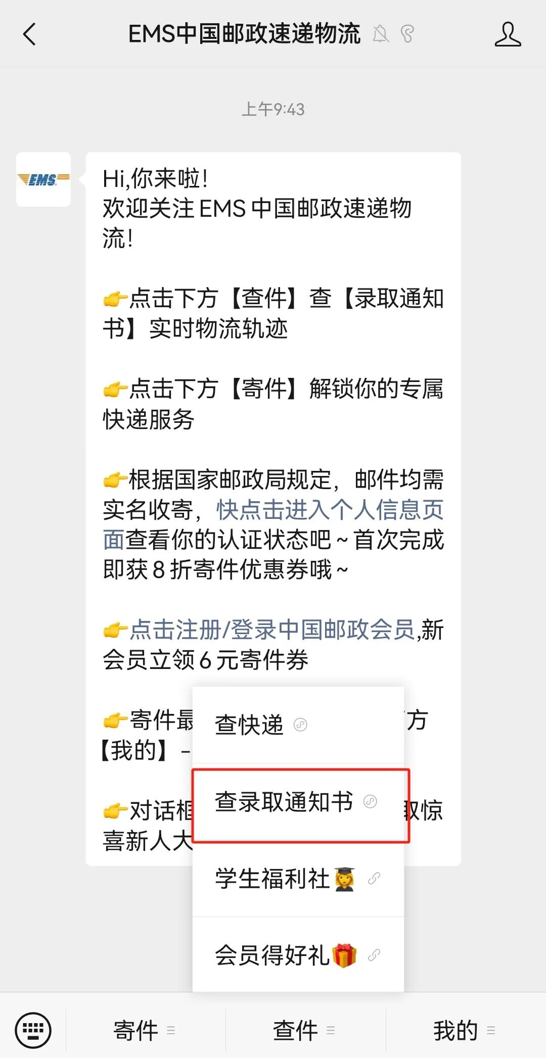 点击公众号“查件”菜单栏里的“查录取通知书”