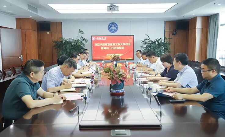 7月18日,南京信息工程大学党委副书记、校长陈海山,校党委常委、副校长刘佳带队来校考察交流。我校党委副书记、校长蔡国军主持座谈交流会,校党委常委、副校长杨科及学校办公室、统战部、教务处、研究生院、科技处、科技成果转化处等相关单位负责人参加座谈。
