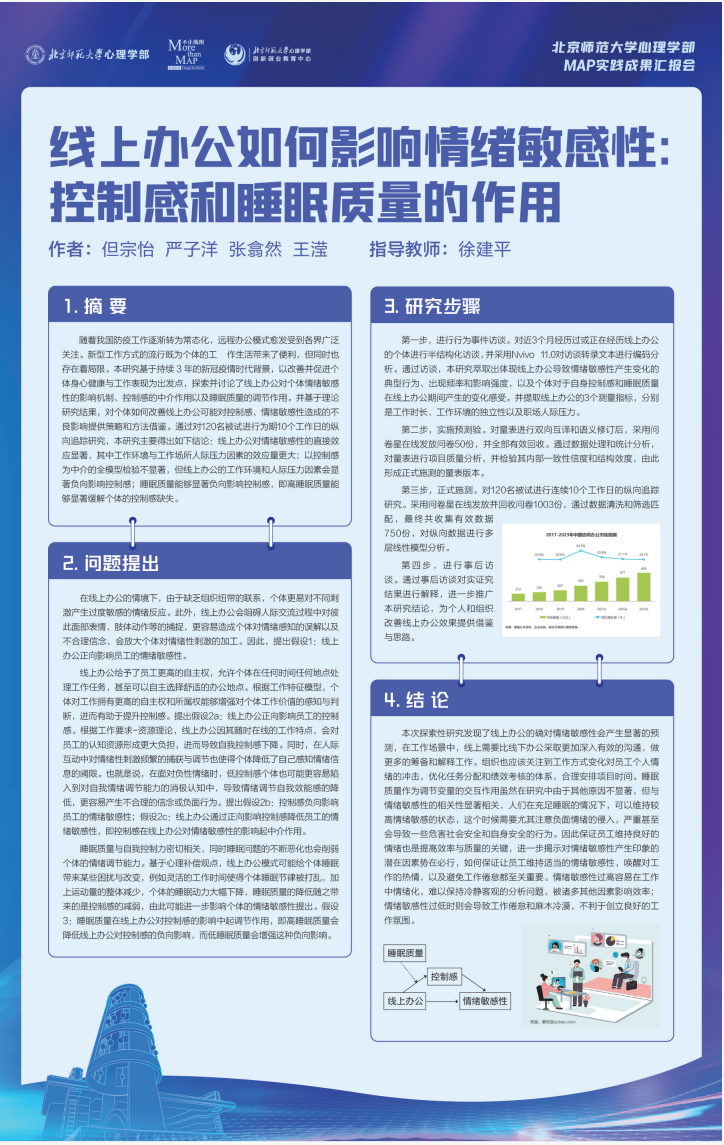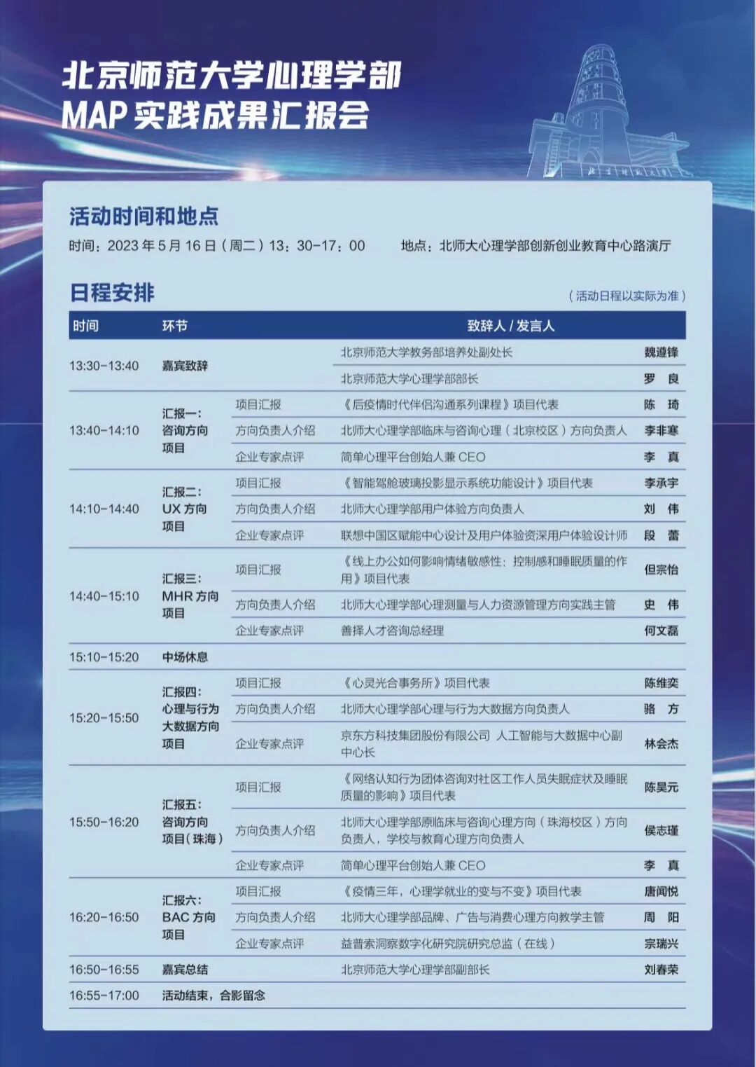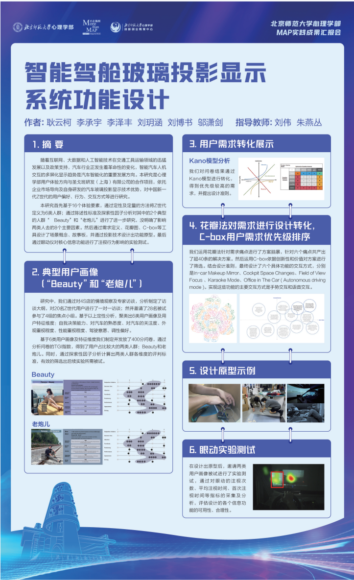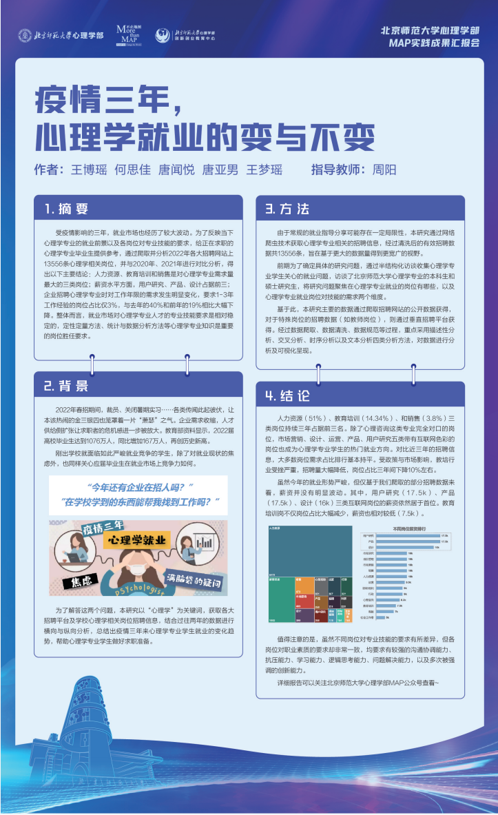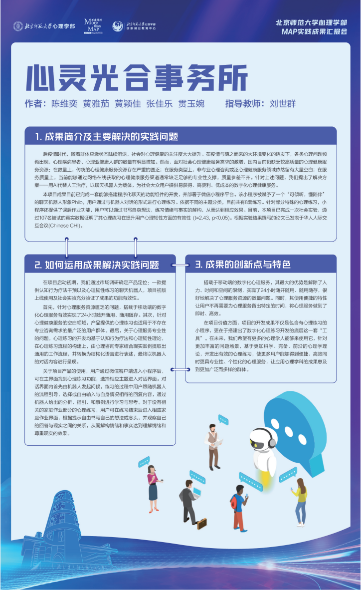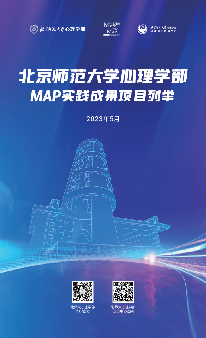 23年5月16日下午,北师大心理学部MAP中心联合创新创业教育中心,拟举办MAP实践成果汇报会,为在校生提供展示平台,分享MAP专业方向中应用类的学生实践项目,介绍方向培养目标与未来发展方向,探索更多心理学应用领域。同时本次活动邀请了具有丰富行业经验和专业素养的企业网评委,将为同学们的项目提供专业性的评估和建议。通过这种评估和反馈,同学们可以了解行业现状和需求,从而对自己的项目甚至项目思路进行改进和优化。同时也能够通过具象的项目让企业能够直观地了解方向的潜力和合作可能。