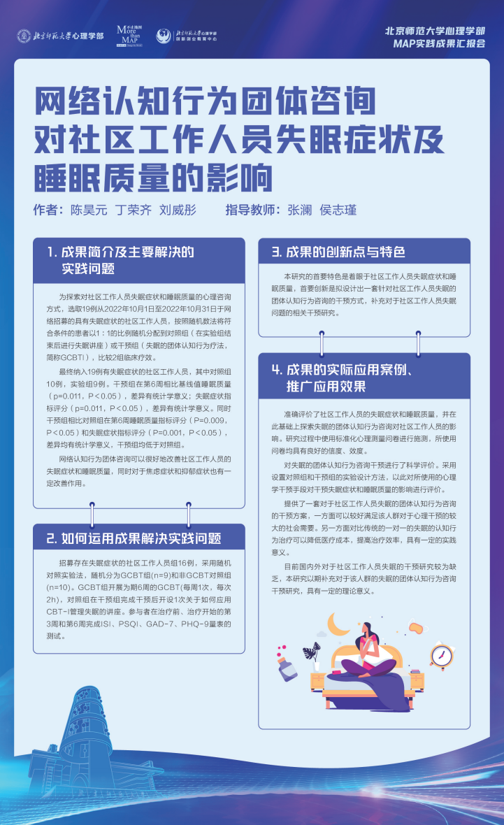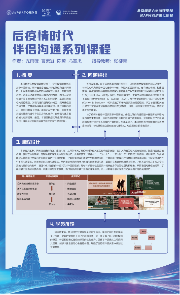 北师大MAP作为首批应用心理专硕的招生院校,自2011年起开始招生,是目前全国最大的应用心理专硕培养基地。2021年起,在北京校区和珠海校区同步招生,总招生规模首次达到400人。经过多年的发展,逐渐探索出一条应用心理专硕培养之路,响应教育部应用心理人才培养的号召,实行研究生分类招生培养,充分发挥学科优势,紧扣“国家急需”、“社会需要”,培养高层次的应用心理专业人才。实践项目制培养是应用心理专硕培养中非常重要的一环,北师大MAP自建立初就高度重视学生实习实践,依托高水平应用领域师资队伍和高质量实践基地,丰富实践类型。疫情下,部分学生参加外部基地的实践受到影响,心理学部投入百万元经费支持学生完成实践项目80余个,覆盖近50%的学生。保障了实习实践质量,并取得了丰硕成果,推进在校生将课堂所学与实际项目相结合,将深入思考和创新思维融入的各环节,为未来的职业生涯打下坚实基础。